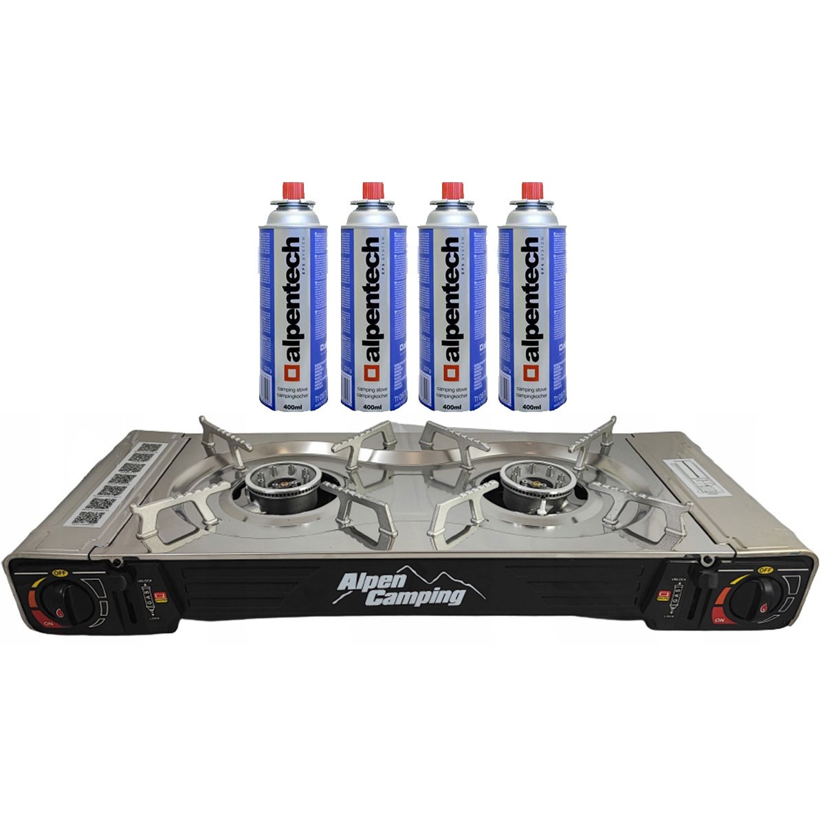 Réchaud à gaz 2 feux 4400W INOX + Cartouches de gaz ALPEN Camping