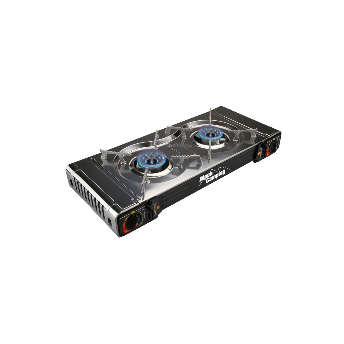 Le Réchaud à gaz 2 feux ALPEN CAMPING est conçu avec une structure en INOX et ALUMINIUM. Il fonctionne avec 1 ou 2 cartouches de gaz butane UN2037 camping standard pour allumer un ou 2 brûleurs. Sa puissance est de 4400W (2 x 2200W). L'allumage de l'appareil est facile grâce à son système PIEZO intégré dans la molette de réglage qui règle l'intensité des feux.