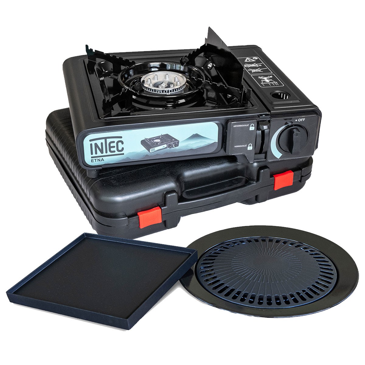 | Libellé | Réchaud à gaz portable 2200W Etna + 2 plaques Plancha et Grill Barbecue Camping Mallette INTEC |