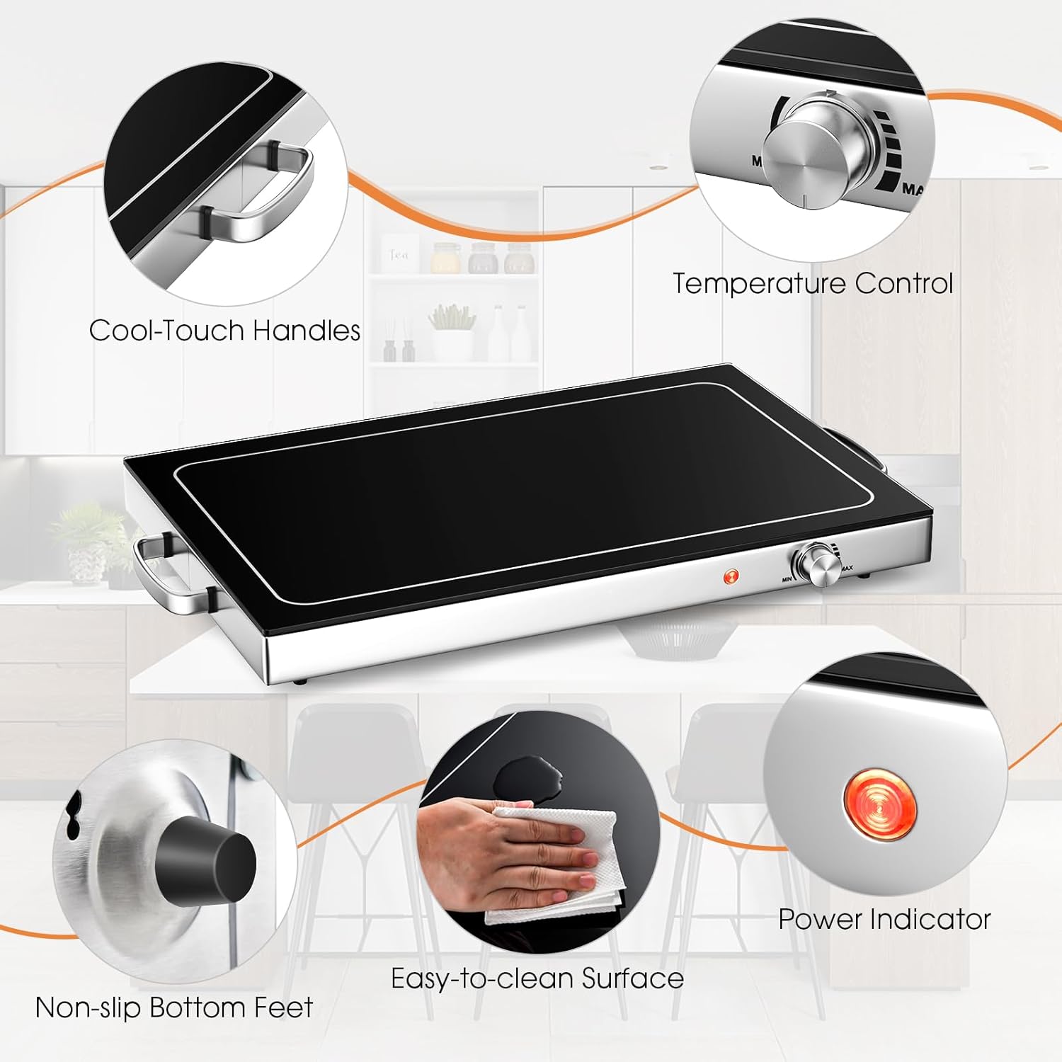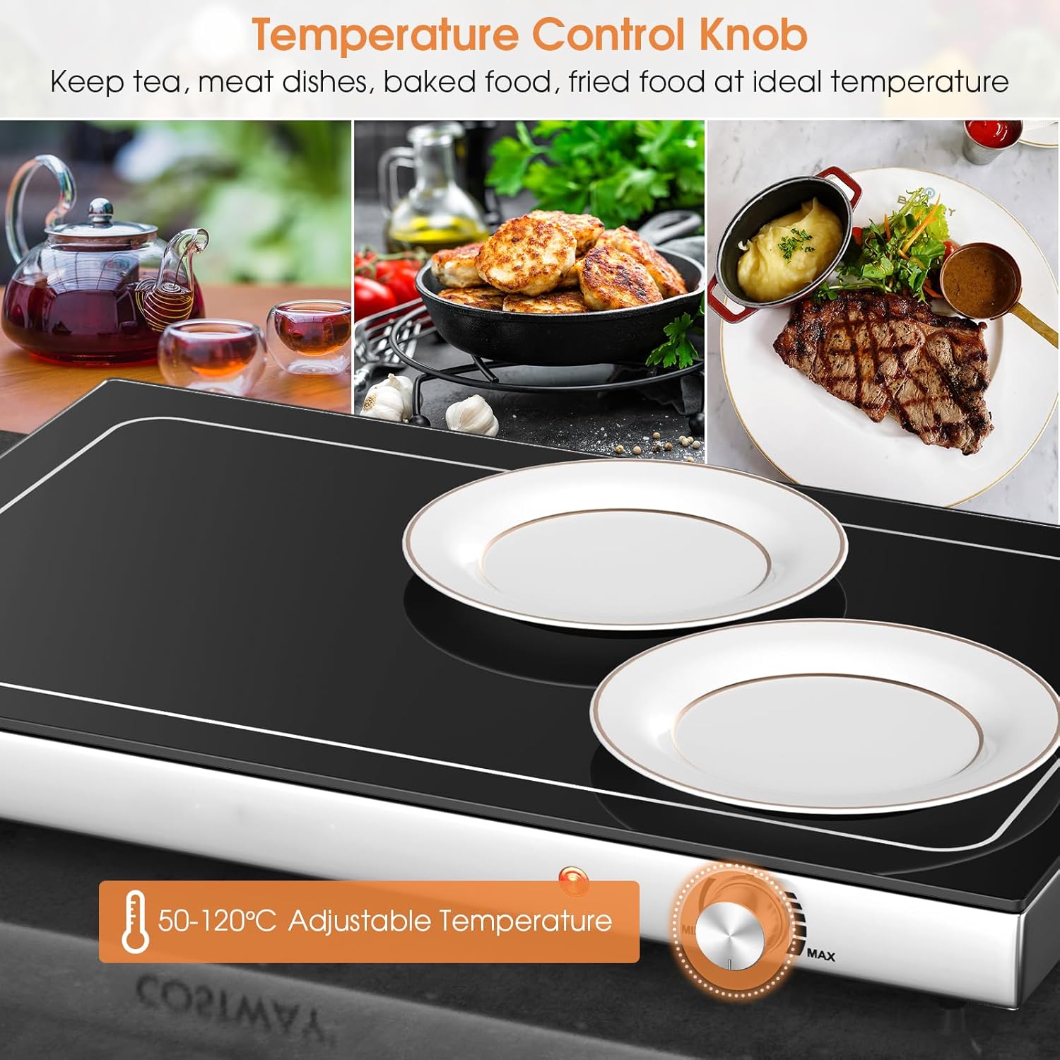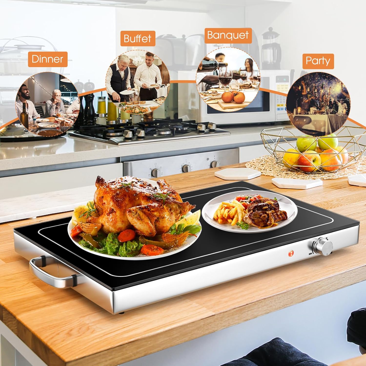• Plateau chauffant de taille familiale : Le plateau en verre trempé résistant à la chaleur mesure 56 cm x 36 cm (L x l), ce qui est suffisamment grand pour contenir une variété de plats. Il peut supporter diverses vaisselles, telles que des plats en émail, en verre ou en céramique. Ce plateau chauffant sera un bon choix pour les réunions de famille, les fêtes, les buffets ou les restaurants.