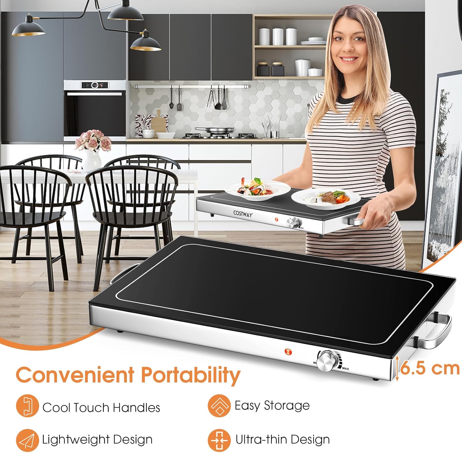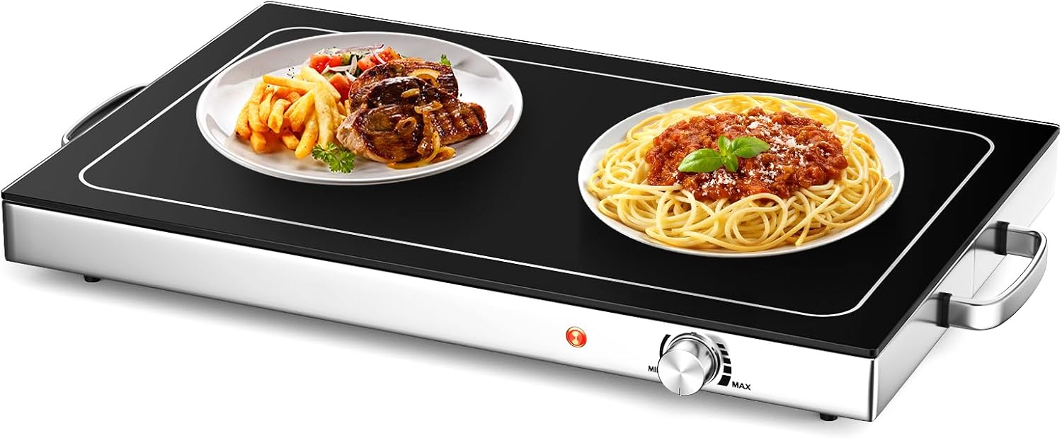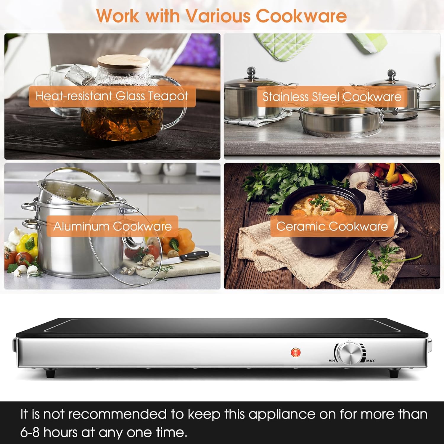 • Plateau chauffant de taille familiale : Le plateau en verre trempé résistant à la chaleur mesure 56 cm x 36 cm (L x l), ce qui est suffisamment grand pour contenir une variété de plats. Il peut supporter diverses vaisselles, telles que des plats en émail, en verre ou en céramique. Ce plateau chauffant sera un bon choix pour les réunions de famille, les fêtes, les buffets ou les restaurants.