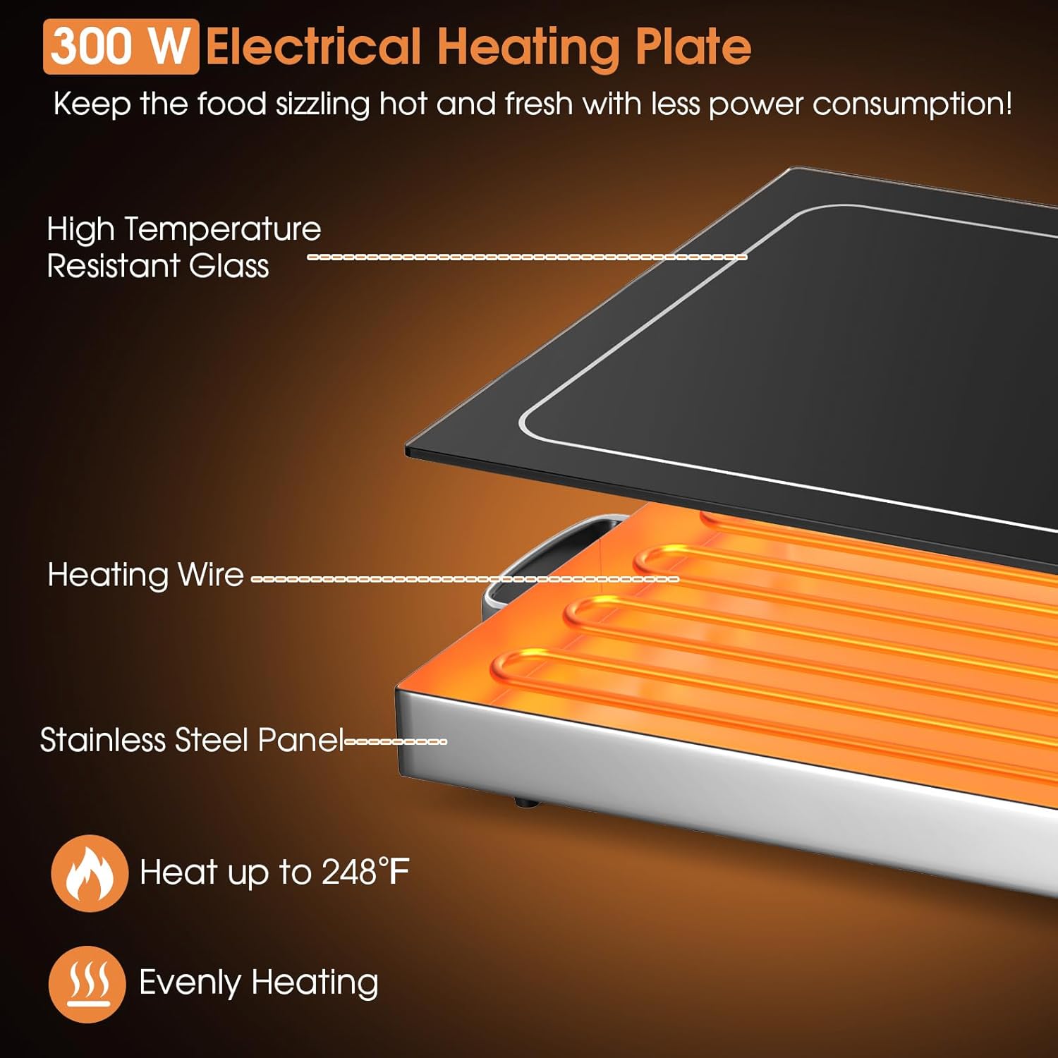 • Gardez toujours vos aliments au chaud : Notre plateau chauffant électrique est conçu avec un élément chauffant de 300 W pour un chauffage uniforme. Il chauffe jusqu'à la température maximale en 20 minutes. Ensuite, la température restera la même pour garder les aliments au chaud pendant longtemps. Conseils : la durée recommandée est de 2 à 3 heures.
