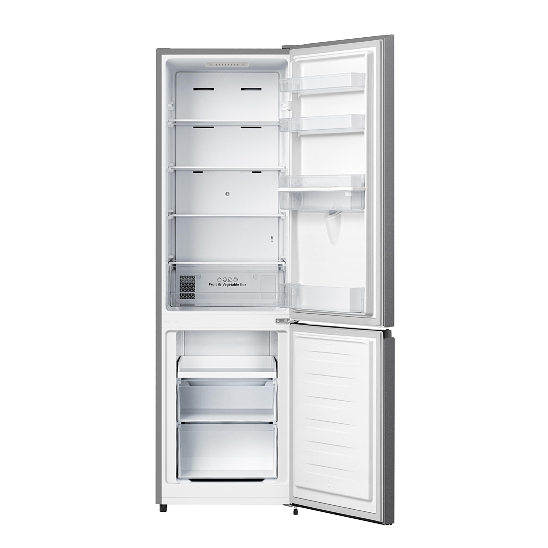 RÉFRIGÉRATEUR COMBINÉ; 3 clayettes amovibles; Bac à légumes; Poignées intégrées; Eclairage LED; Couleur: Métal Brillant; dimensions H x L x P : 179,5 x 55 x 55,7 cm