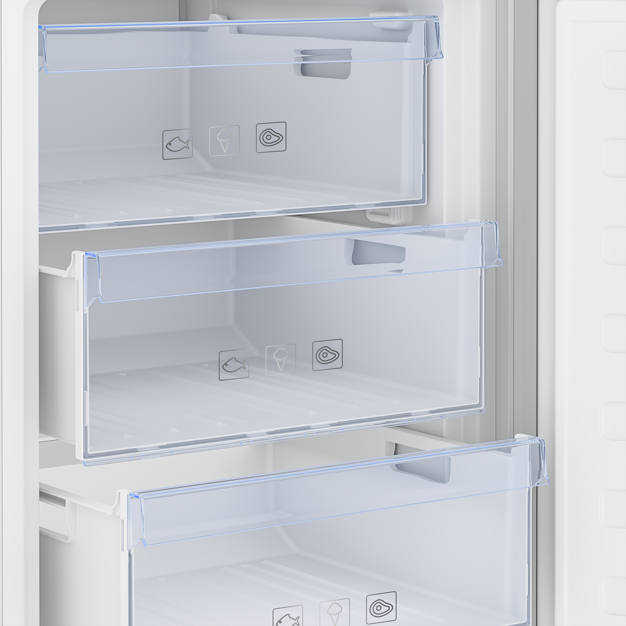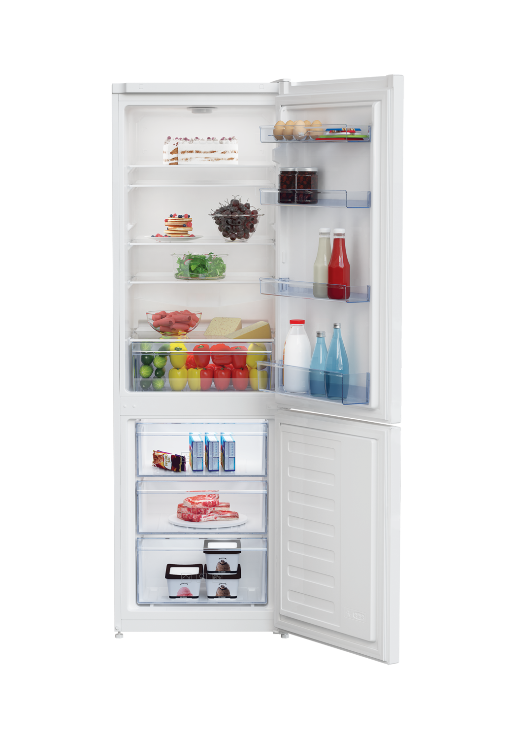 RCSA270K30WN - réfrigérateur combiné 54cm 262l statique blanc - Réfrigérateur combiné Beko RCSA270K30WN doté de la technologie MinFrost® : grâce à l'évaporateur intégré dans les parois du congélateur, la formation de givre est divisé par deux. De plus les clayettes en verre Securit entre chaque tiroir permettent de moduler l'espace de stockage selon vos besoins. Avec sa largeur de 54 cm, ce réfrigérateur répond à vos contraintes d'espace et s'installe facilement dans des petites pièces. Grâce à l'ouverture de porte sans débord, installez où bon vous semble votre appareil: contre un mur ou à côté d'un meuble, l'ouverture n'est plus gênée. Vous pouvez choisir le sens d’ouverture de votre porte et la changer par vous-même, pour adapter votre réfrigérateur à la configuration de votre pièce. Beko s’engage à conserver les pièces détachées de cet appareil pendant 11 ans, à compter de la première date d’achat par les consommateurs.