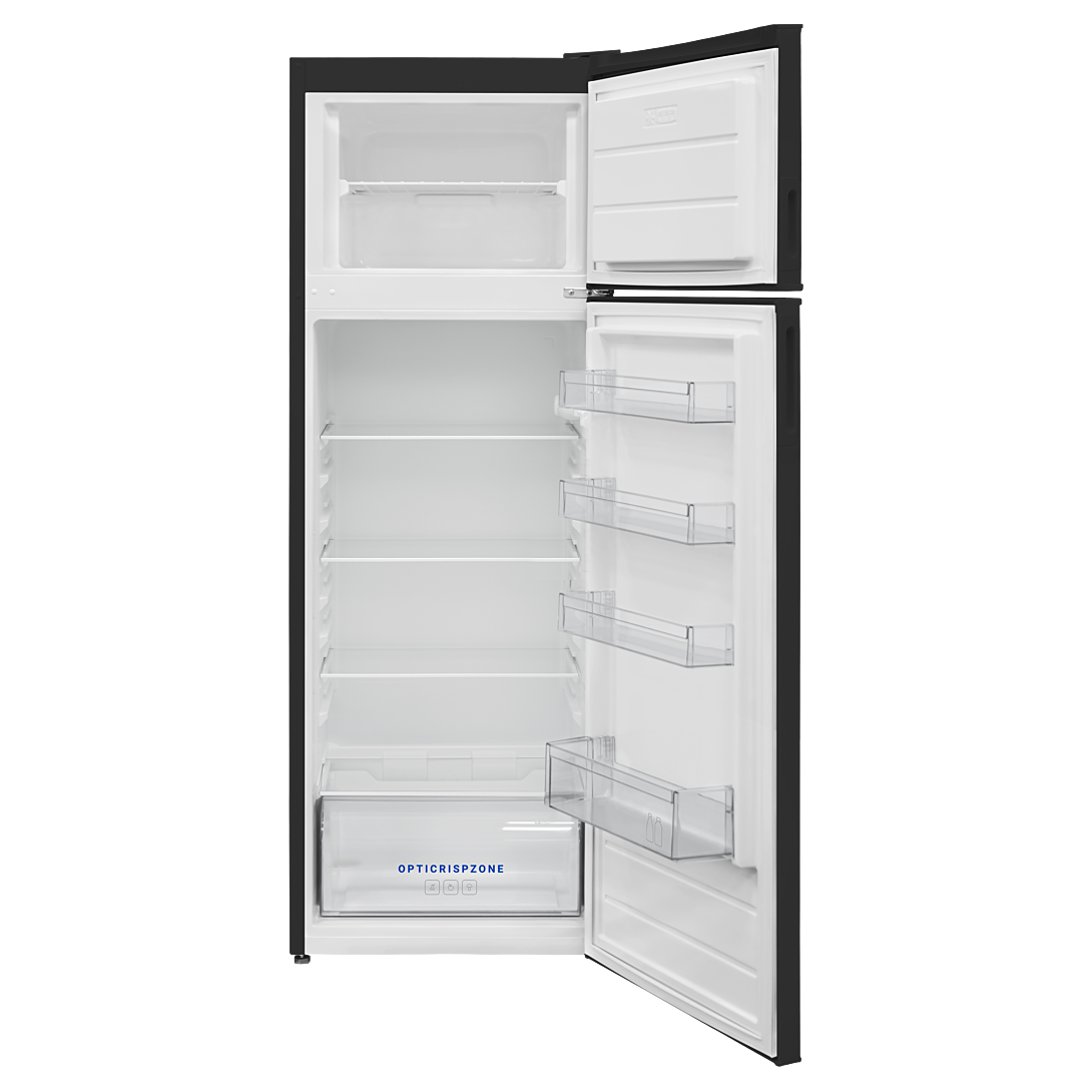 Réfrigérateur 2 portes, 243L, Classe D, Lil-Frost, clayettes verre, Opticrisp zone qui permet de garder les fruits et légumes plus longtemps, éclairage LED, NOIR LIL-FROST : Un réfrigérateur préservé de la formation de givre OPTICRISP ZONE : Des fruits et légumes frais plus longtemps grâce à l'ajustement du taux d'humidité. ODOUR FREE : Des aliments préservés des transferts d'odeur entre les compartiments réfrigérateur et congélateur.
