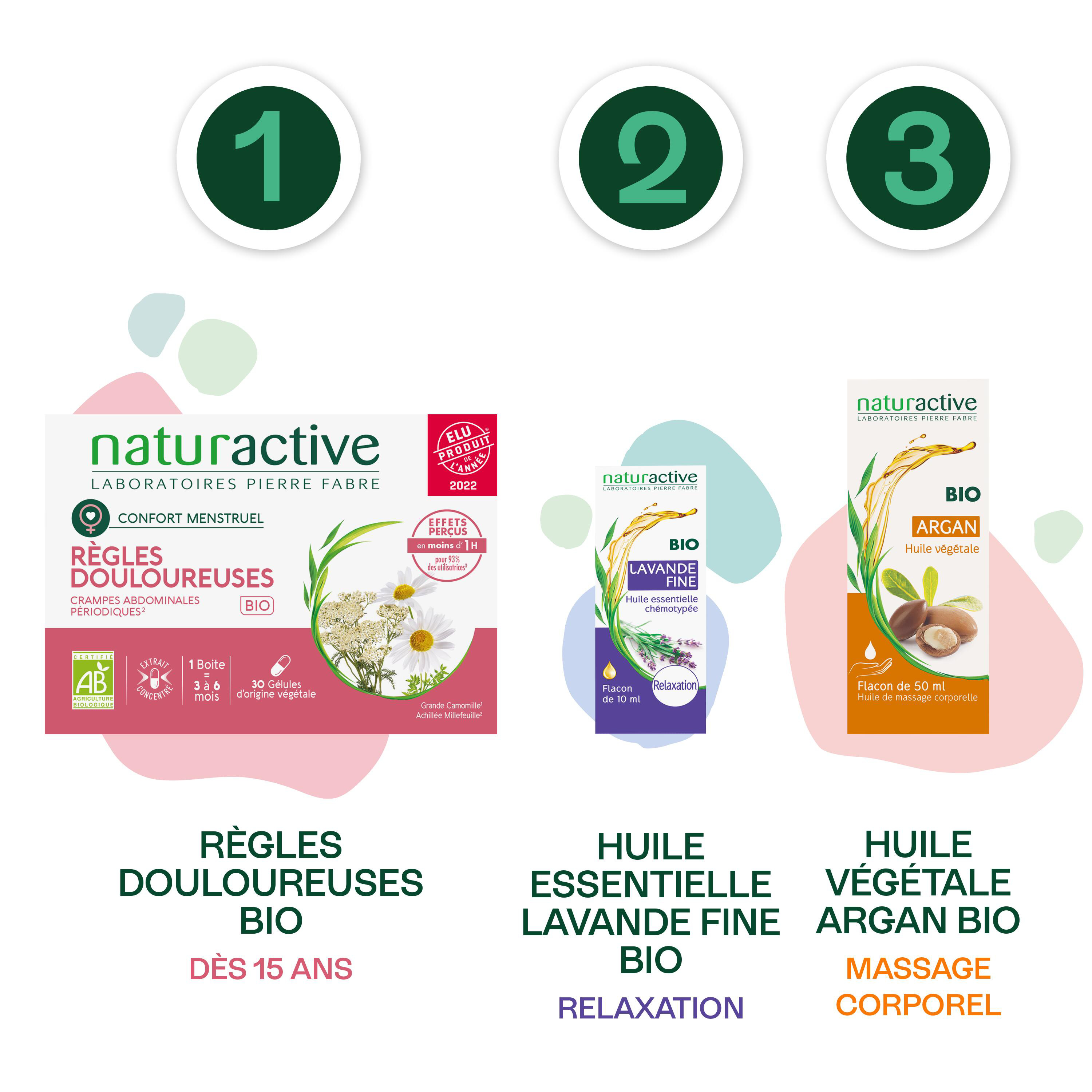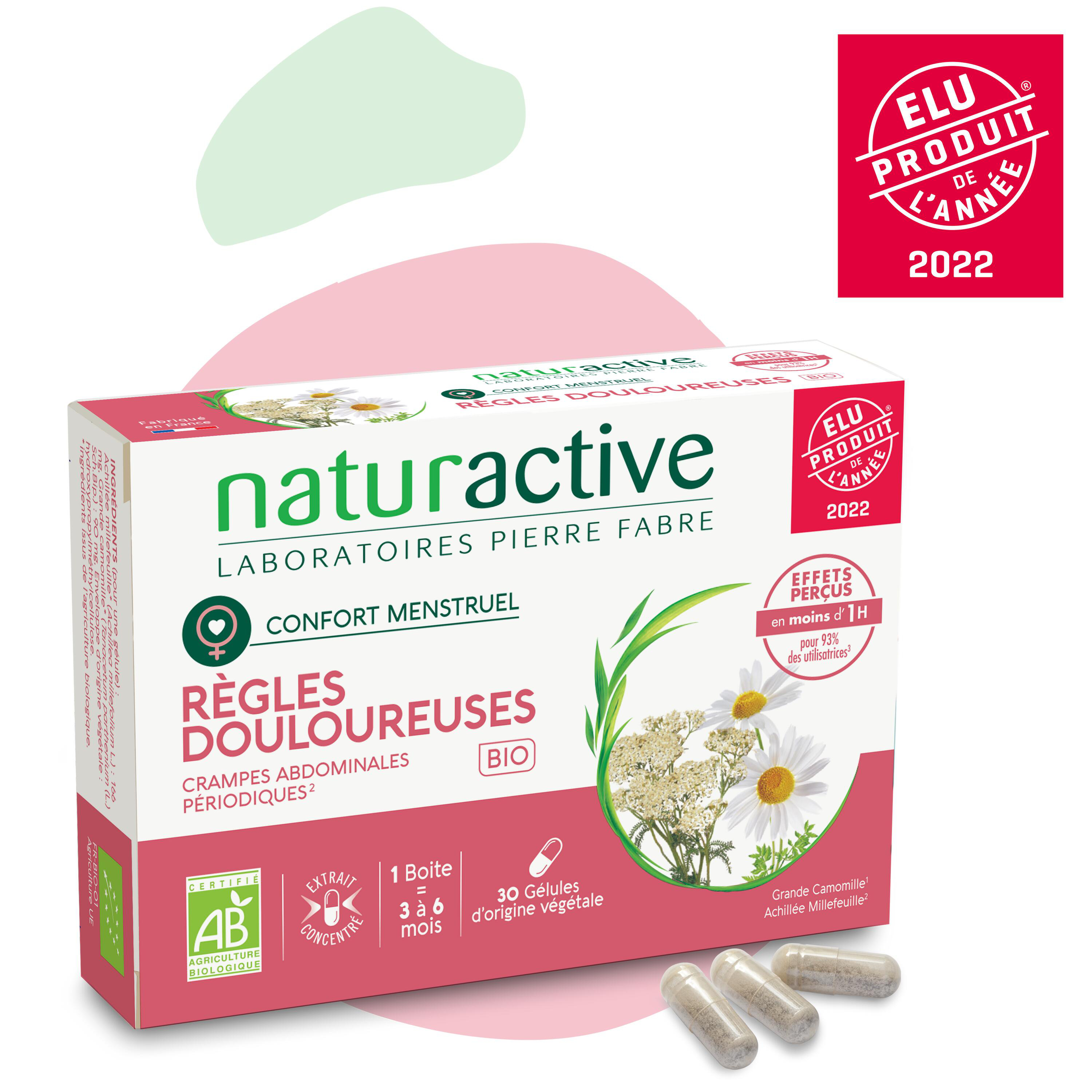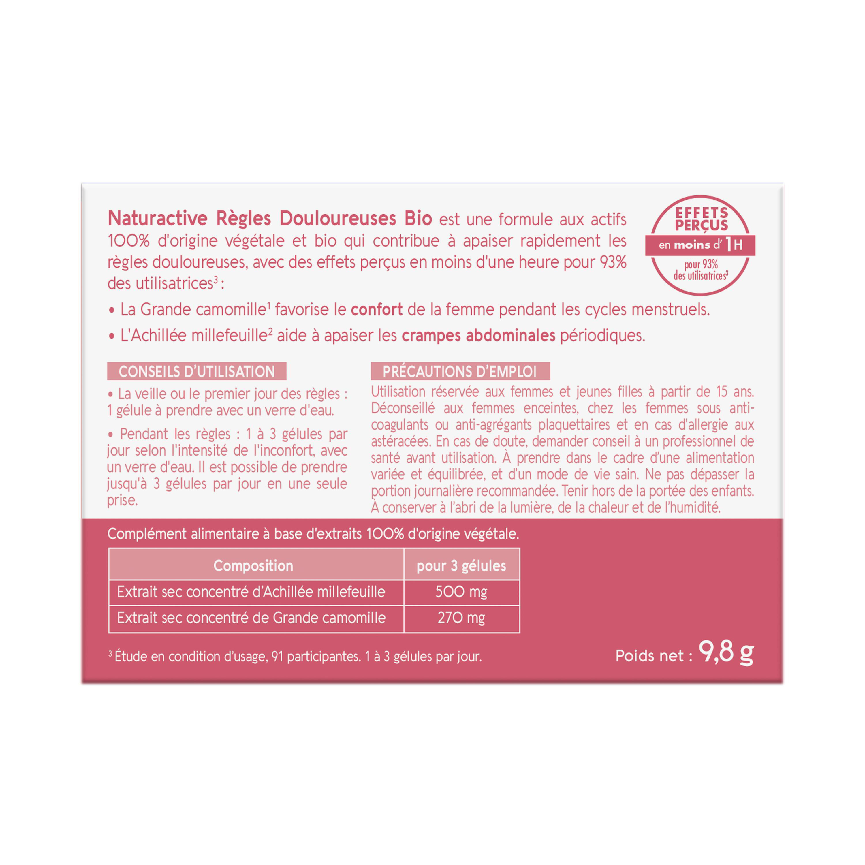 Naturactive Règles Douloureuses Bio, la solution 100% naturelle et bio qui permet de soulager les règles douloureuses avec une efficacité perçue en moins d'une heure chez 93% des utilisatrices.