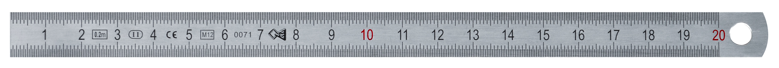 Réglet acier mat semi-rigide. Graduation gravée recto et verso en 1/2 mm. Dizaines en rouge.