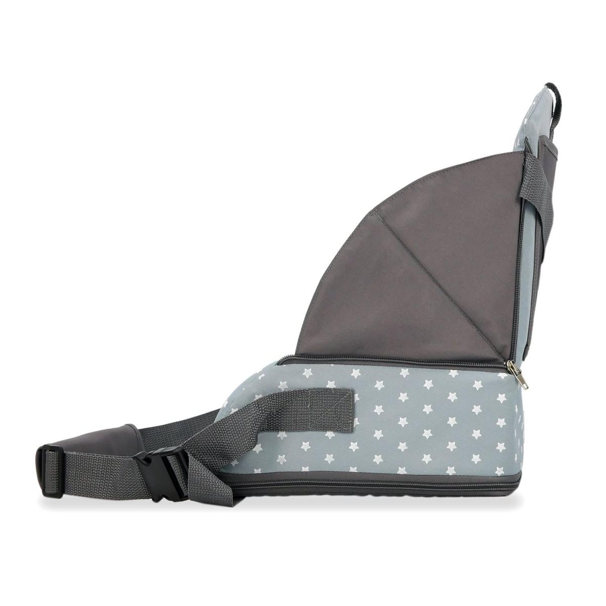 Textile haute densité. Chaise haute à fixer sur une chaise. Poignée de transport. Hauteur dossier 25 cm. Harnais de sécurité. Poche intégrée.
