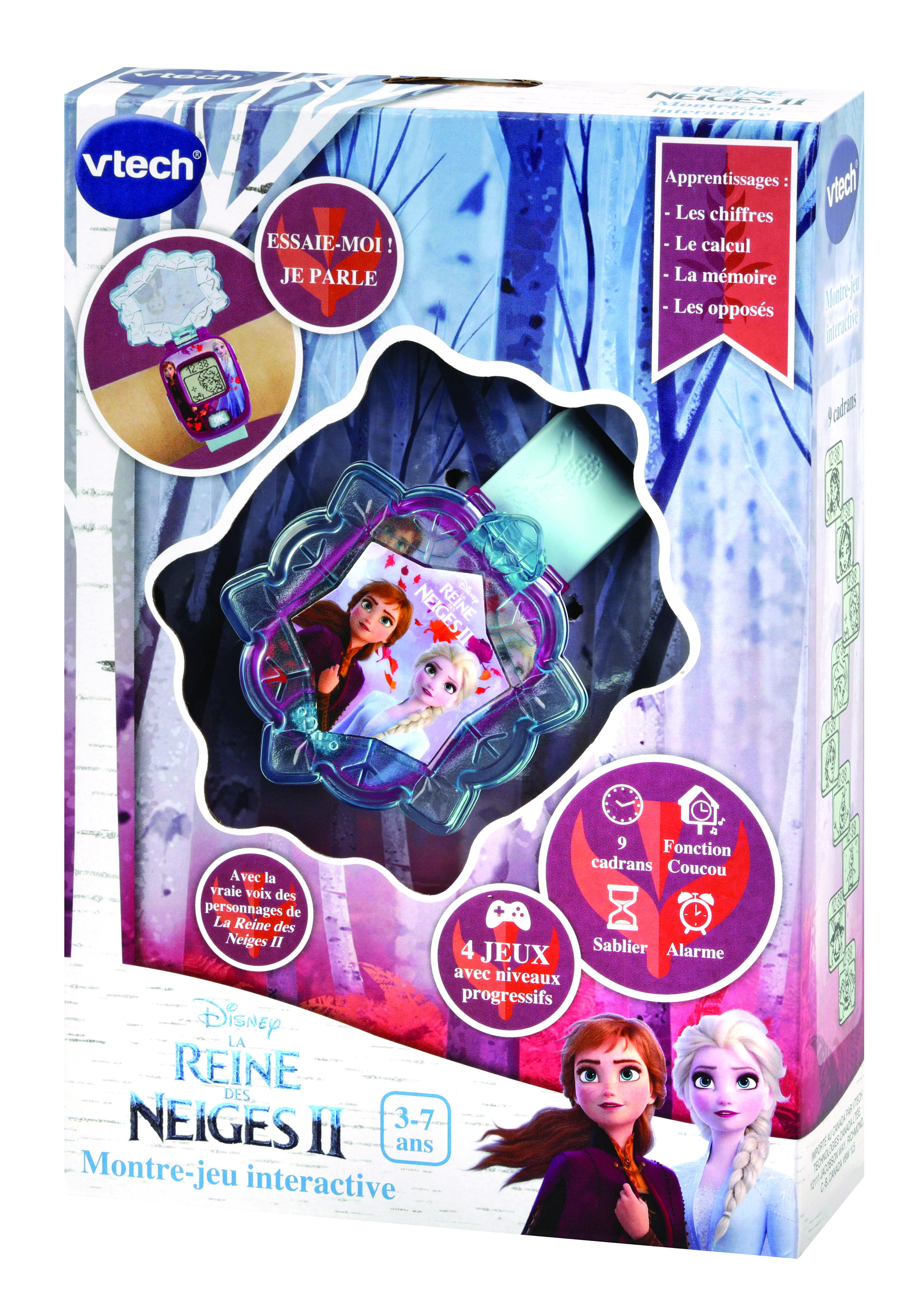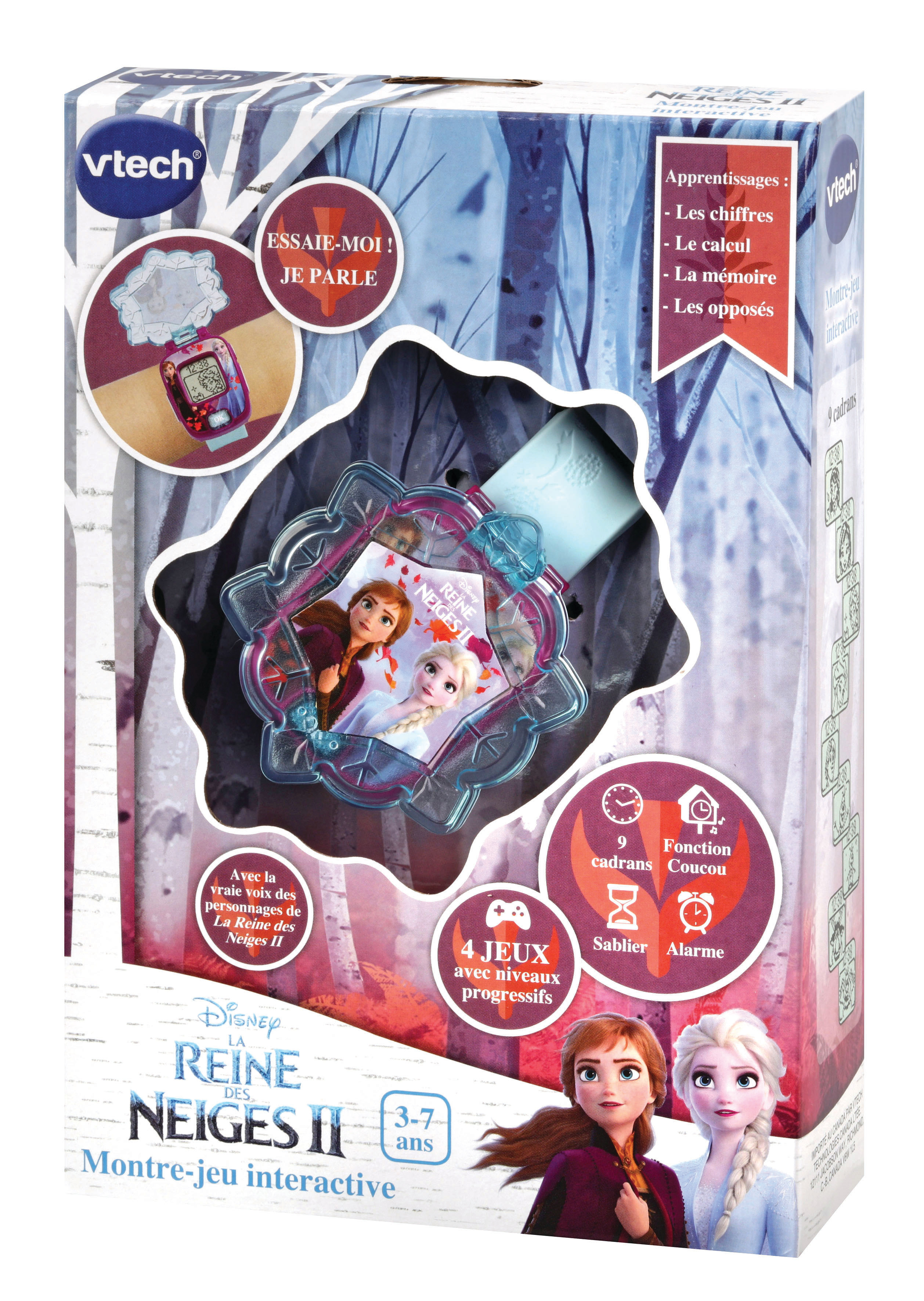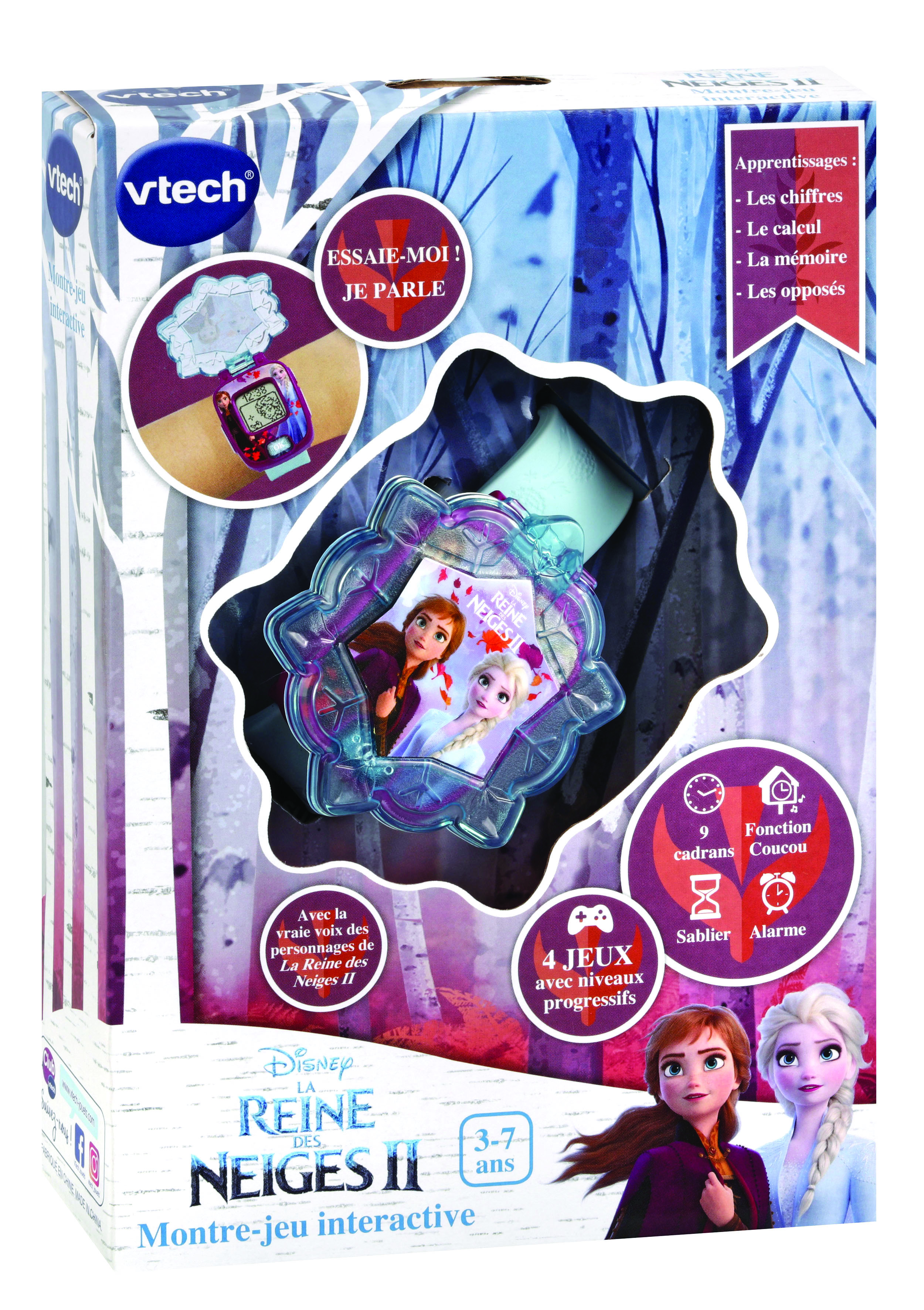 La Reine des Neiges II - La montre-jeu interactive - 3 - 7 ans Une montre multifonction parlante aux couleurs de La Reine des Neiges II. Avec un écran animé pour jouer et apprendre avec ses personnages préférés ! 9 cadrans Reine des Neiges II pour personnaliser sa montre. Un bouton lumineux pour jouer avec ses personnages préférés. 4 jeux pour faire plein de découvertes, apprendre à compter, découvrir les nombres, exercer sa mémoire et son sens de l’observation avec les personnages de la Reine des Neige II. Double affichage de l’heure : analogique ou digital. Fonctions alarme/réveil, coucou (qui retentit toutes les heures, fonction désactivable), chronomètre et sablier. Avec la vraie voix des personnages de La Reine des Neiges II ! Boîte try-me. Fonctionne avec 1 pile bouton CR2450 fournie.