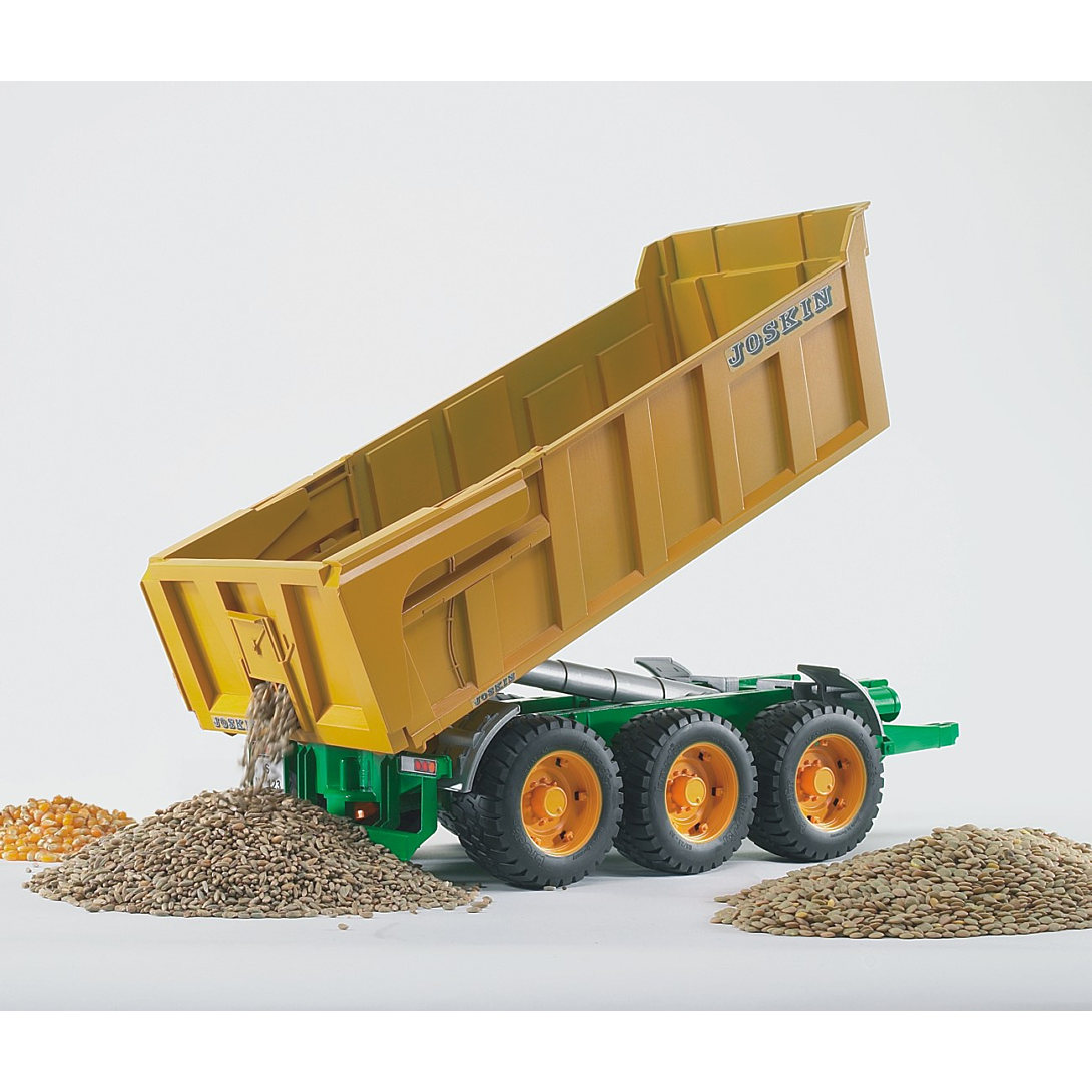 La remorque Joskin dispose d'un verrin de relevage multi-position. La porte arrière ainsi que la trappe qui figure sur celle-ci peuvent s'ouvrir. La remorque dispose d'un châssis trois essieux et d'une benne a très grande capacité. Dim.: 45.7x18.1x20.8 cm
