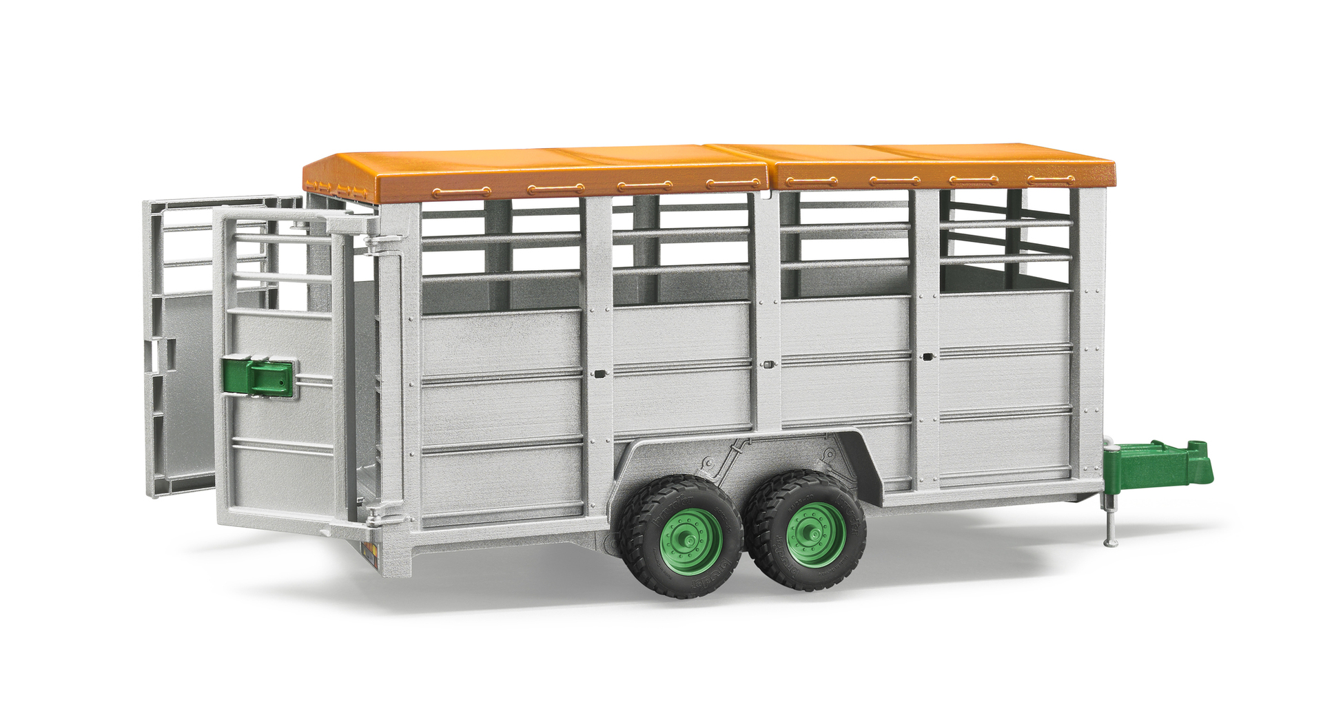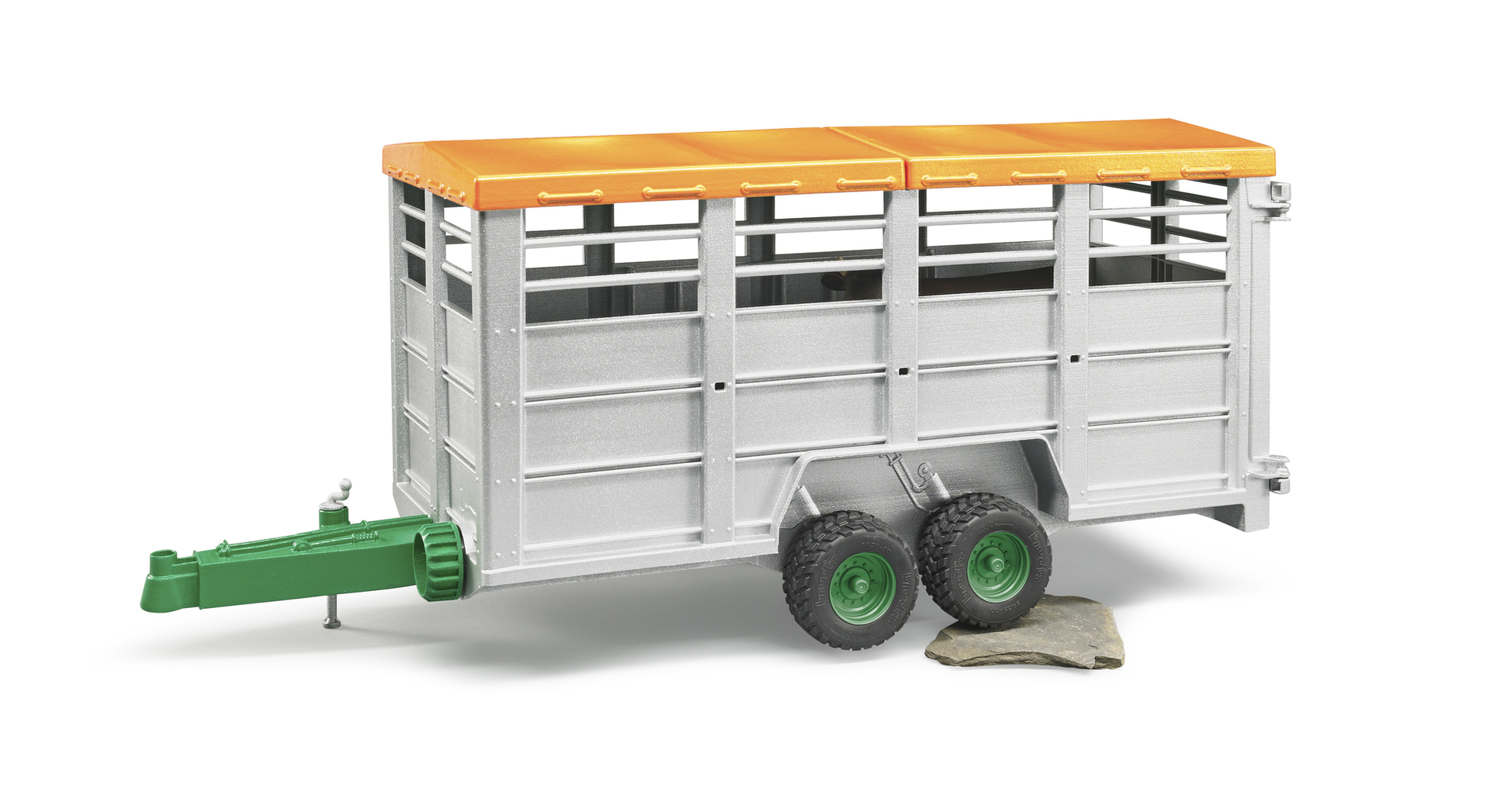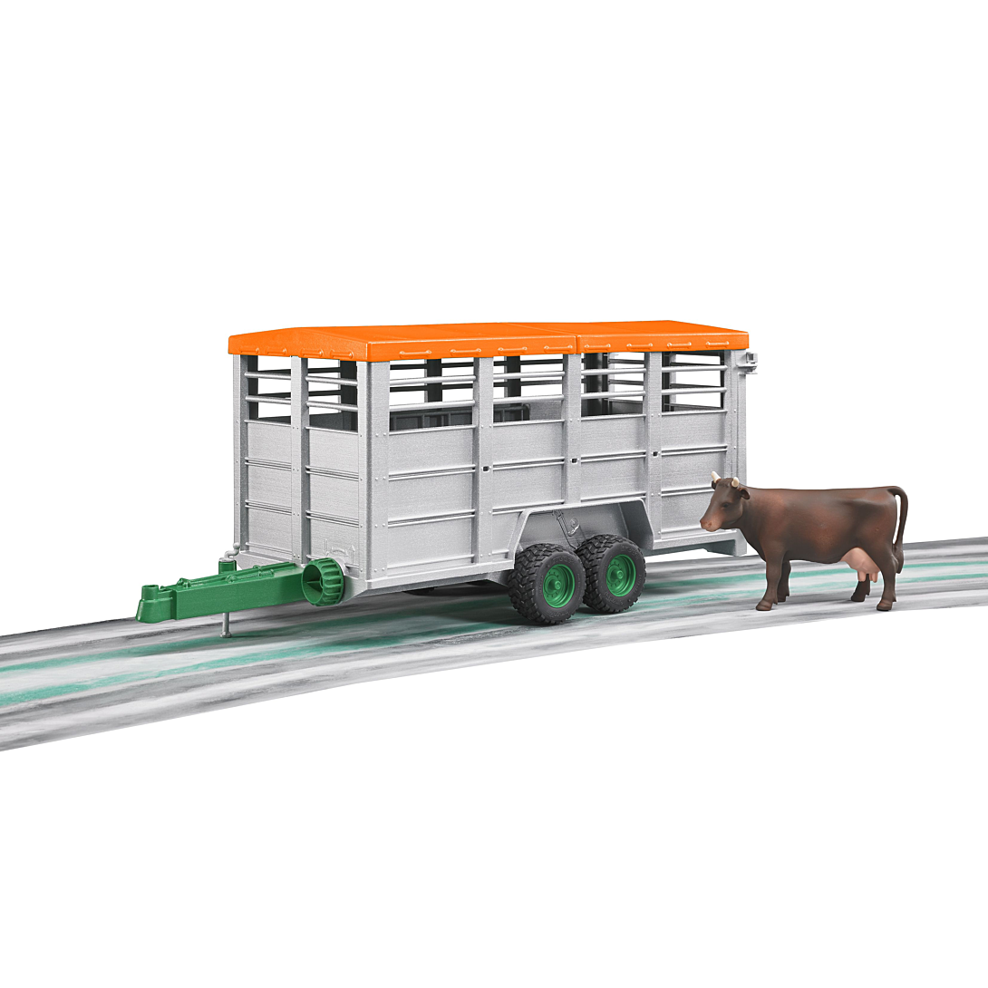 Le toit de la bétaillère est amovible, les portes arrières s'ouvrent, la bétaillère s'incline pour permettre au bétail de monter ou descendre du véhicule. Une vache incluse. Dim. : 48.2x17.1x20.2 cm