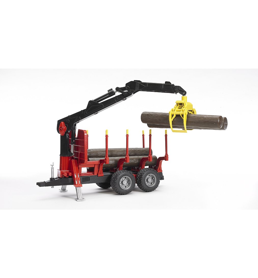 Remorque forestière avec grue de chargement et déchargement. La grue pivote à 360°. L'attelage arrière permet d'atteler un autre matériel Bruder à l'arrière de la remorque. 4 troncs inclus. Dim. : 42.9x16.8x19.5 cm