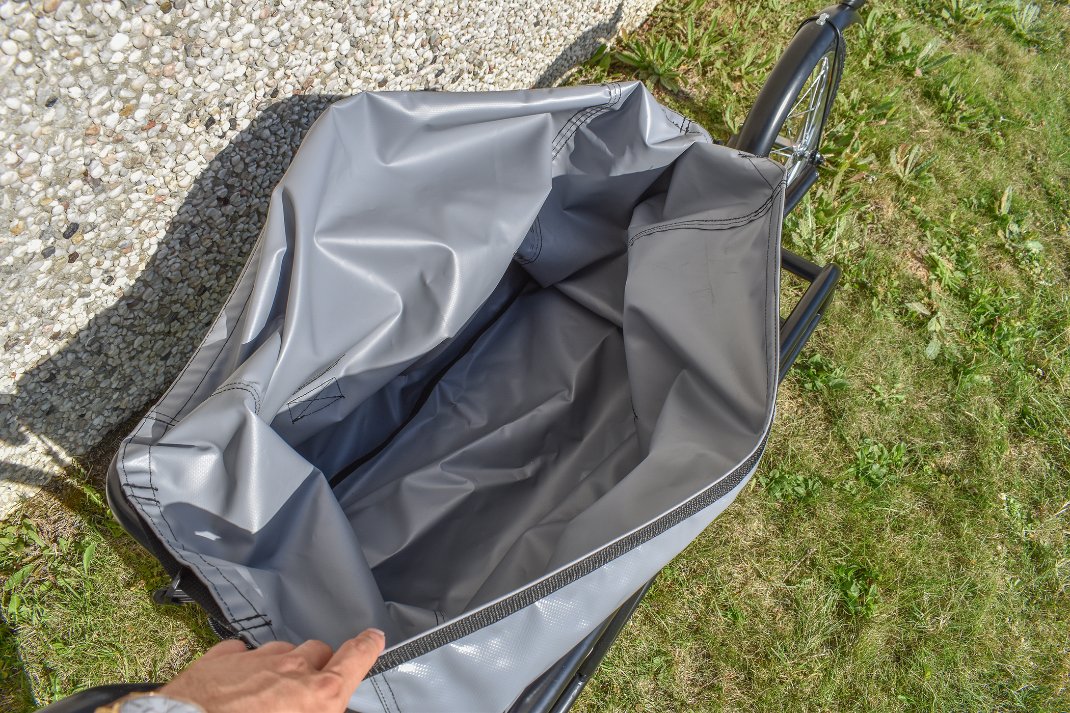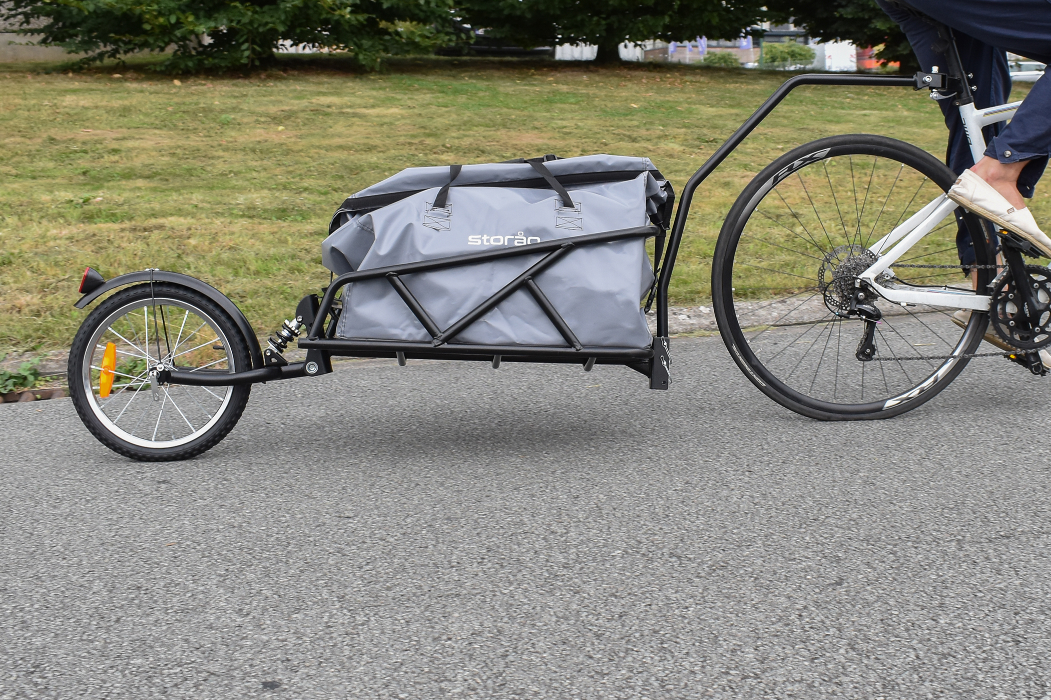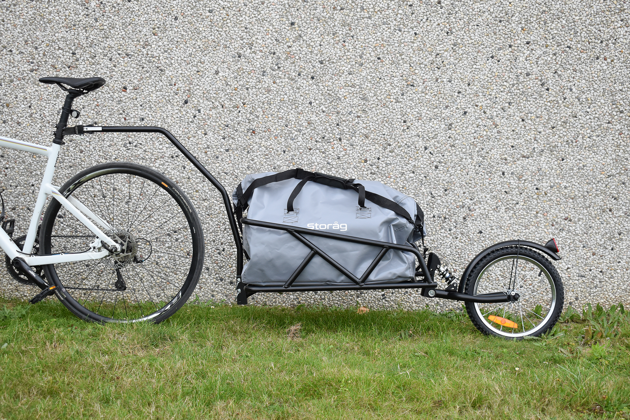 Remorque mono-roue amortie avec sac étanche Storag. Attache pour tige de selle vélo, espace de rangement 65 x 35 x 25 cm (L x l x H). Charge maximale de 27kg. Maniable et facile à tracter grâce à sa roue de 16''. Elle est d'un usage très flexible. Le sac étanche à l'arrière est suffisamment grand (120L) pour y stocker des objets encombrants. Fermeture du sac par rabat couvrant, pas de fermeture à glissière. Dimension espace charge (longueur x largeur x hauteur): 65 x 35 x 25 cm - Dimension extérieure totale (longueur x largeur x hauteur): 200 x 41 x 80 cm - Dimension carton (longueur x largeur x hauteur): 82,5 x 41 x 40 cm - Taille du sac: 120 L - Charge MAX. 27kg