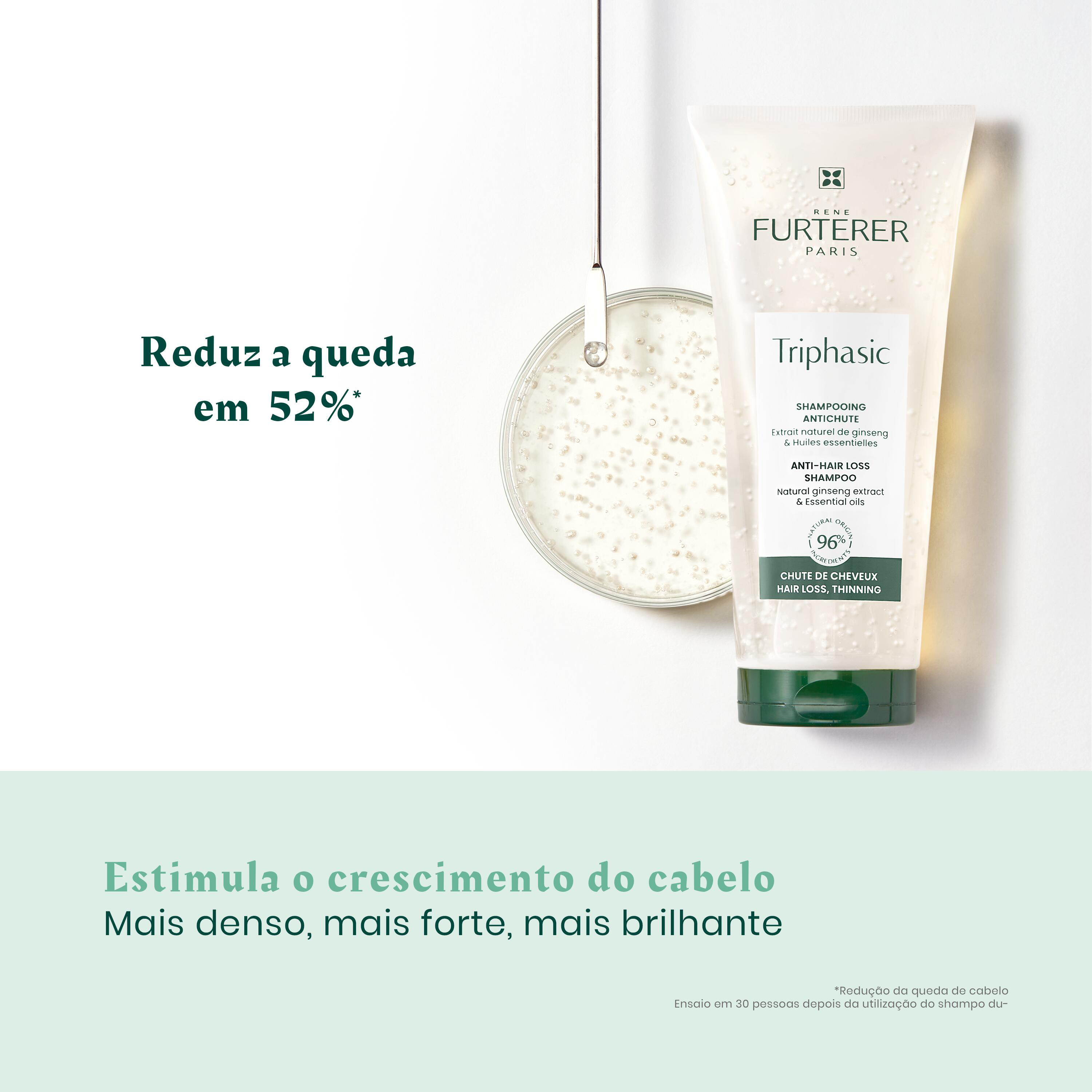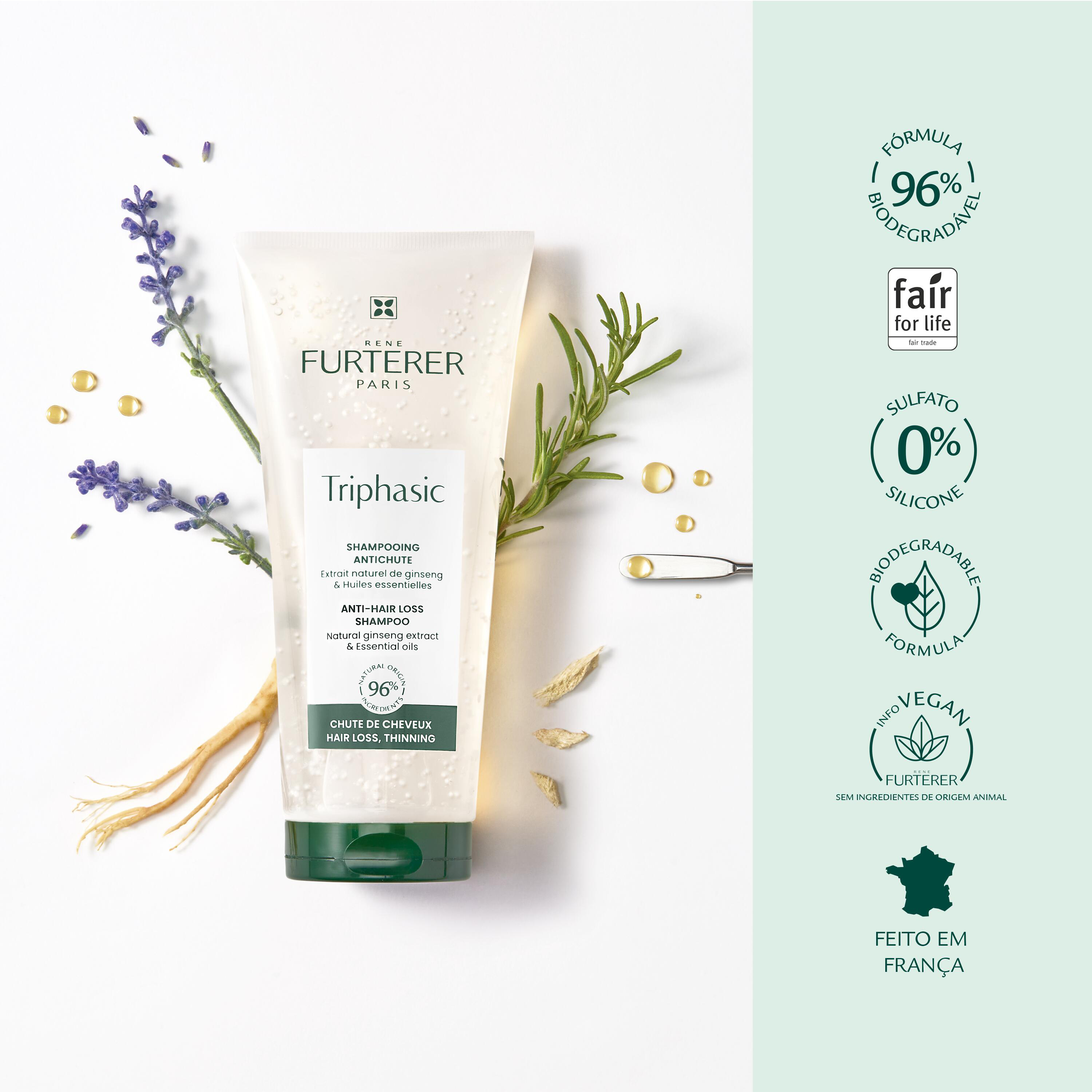 Le Shampooing traitant antichute TRIPHASIC réduit la chute de cheveux sans agresser le cuir chevelu. Sa formule sans silicone associe la Vitamine B5, les extraits naturels de Pfaffia bio et de Ginseng qui contribue à tonifier le cuir chevelu, et aux pouvoirs stimulants des Biosphères d’huiles essentielles pour freiner la chute et favoriser la pousse de cheveux plus denses, plus épais. La texture transparente du produit laisse apparaître ces Biosphères blanches et nacrées, qui éclatent délicatement sous les doigts au moment du shampoing. Nettoyés en douceur et plus résistants, les cheveux sont faciles à démêler, doux et brillants. 96% d'ingrédients d'origine naturelle. Sans silicone, sans tensio-actifs sulfatés. Formule biodégradable*. *Selon OCDE301B.