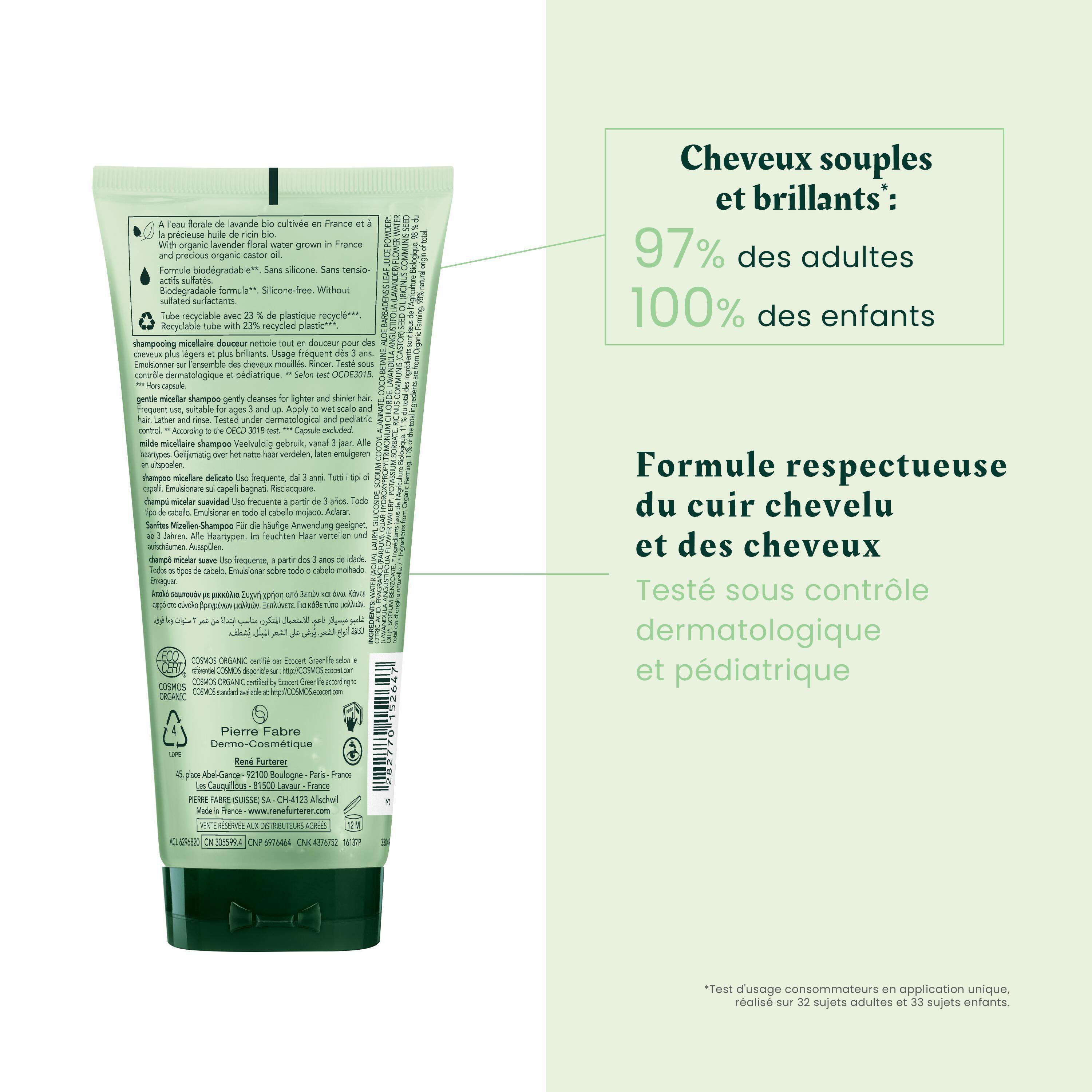 Ce shampoing ultra doux usage fréquent nettoie efficacement tous les types de cheveux, même délicats. Basé sur la technologie micellaire, il élimine parfaitement les impuretés tout en respectant l'équilibre du cuir chevelu. L'eau florale de lavande bio et l'huile de ricin bio s'associent au cœur de sa formule pour un nettoyage expert tout en douceur. Véritable source de plaisir pour les sens grâce à son parfum floral 100% d'origine naturelle et à sa mousse délicate, il convient à toute la famille dès 3 ans. Il peut s'utiliser en relais des rituels de soins René Furterer. Shampooing certifié bio. Formule 98% d'origine naturelle. Biodégradable*. Vegan**. Sans silicone. Sans tensio-actifs sulfatés. *Selon test OCDE301B. **Sans ingrédient d'origine animale.