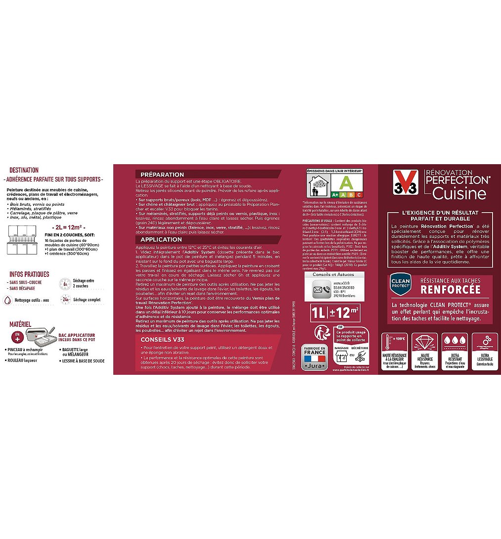 LA PEINTURE HAUTE RÉSISTANCE POUR MODERNISER VOTRE CUISINE. Envie de donner un nouveau style à votre cuisine ? Changez la couleur de vos meubles, appareils électroménagers, crédences ou plans de travail grâce à la peinture RÉNOVATION PERFECTION ®. Ultra-adhérente, anti-taches et anti-chocs, elle résiste aux conditions difficiles de la vie quotidienne d’une cuisine. RÉSULTAT IMPECCABLE . Tendu parfait . Finition durable dans le temps HAUTE RÉSISTANCE . Rayures, frottements, chocs . Projections d’eau, condensation . Chaleur jusqu’à 100°C (convient pour mur derrière plaque cuisson) FACILE À VIVRE . Application directe, pas besoin de poncer, ni décaper . Adhérence sur tous supports . Lessivable au quotidien