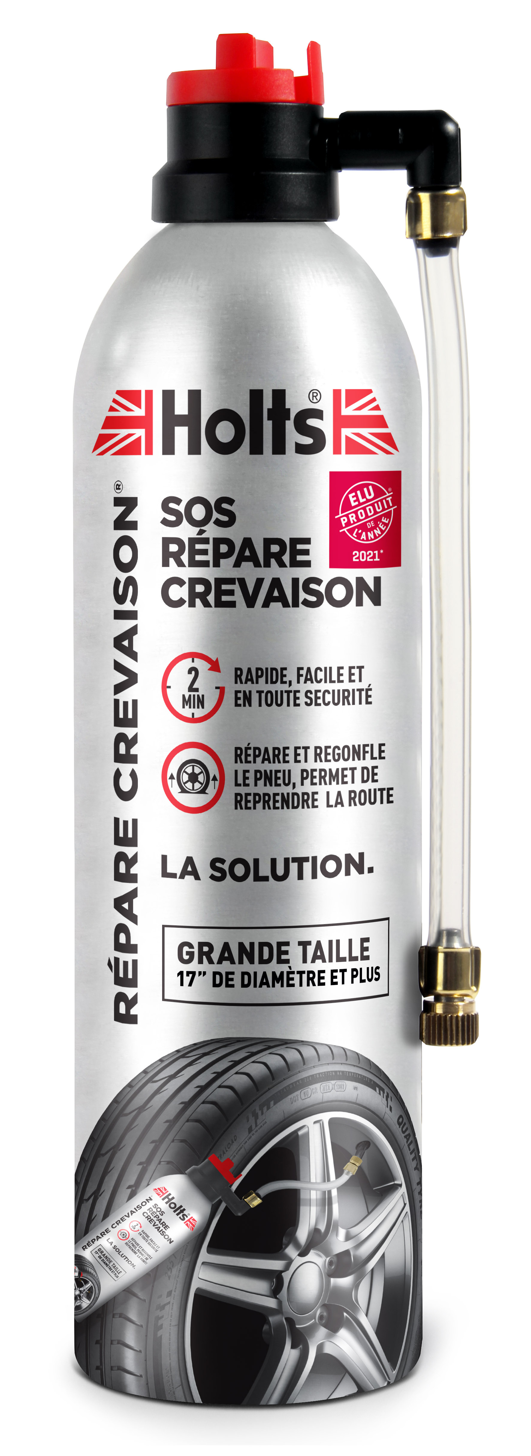 Holts - Répare-Crevaison 500 ml Le Répare Crevaison Holts est un système de réparation provisoire d’urgence rapide sûr et sans effort. En quelques secondes son mélange de gaz et de latex recouvre l’intérieur du pneu crevé, le répare et le regonfle, le tout sans l'endommager afin de le faire réparer ensuite par un spécialiste. Avantages : • Répare et regonfle sans outil sans démontage • Mélange gaz/latex répare et regonfle le pneu crevé en 2 min. chrono ! • Système exclusif 1/4 de tour pour un transfert automatique du produit • Formule non toxique, n’endommage pas les pneus • Le pneu peut être nettoyé facilement après utilisation du produit • Compatible avec les pneus équipés de capteurs de pression