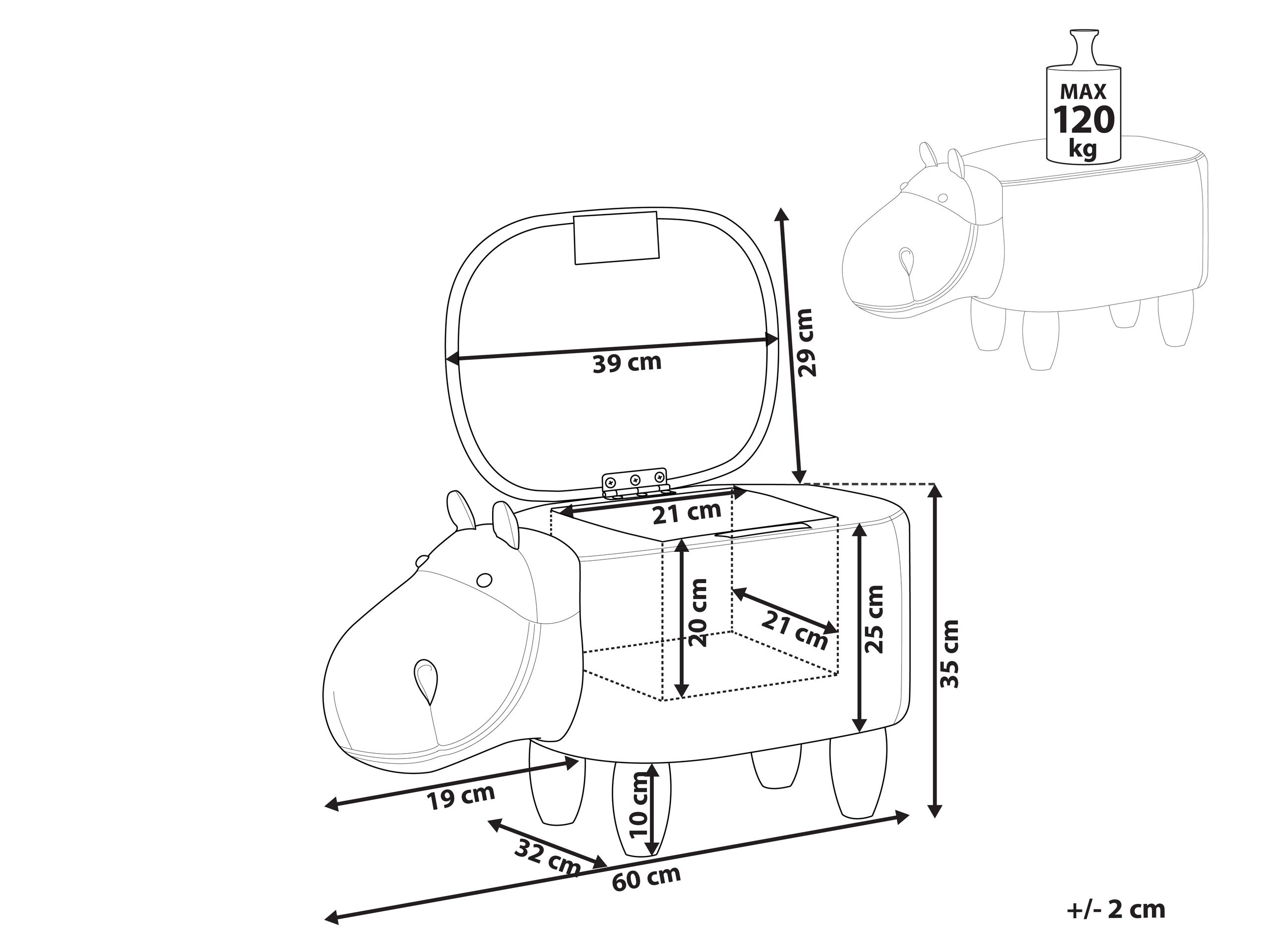 Pouf animal hippopotame avec rangement. Ce tabouret en forme d'hippopotame sera parfait dans une chambre d'enfant! Ce dernier est un produit très polyvalent qui pourra servir de siège, pouf, compagnon de jeu ou encore de compartiment secret. En effet l'intérieur du tabouret peut être utilisé comme lieu de stockage supplémentaire. Vous pourrez notamment y ranger jouets ou autres objets envahissants dans ce compartiment. Grâce aux pieds arrondis en bois laqué et aux bords doux, le tabouret est un compagnon de jeu sûr et parfait pour un enfant. Il a également une tête en peluche douce et de jolis petits yeux en plastique qui rajouteront sans nul doute du charme à votre intérieur.