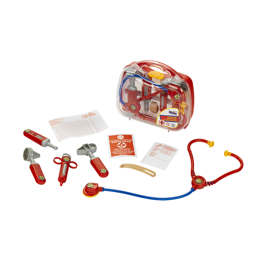Cette mallette de docteur transparente, en plastique de grande qualité, est équipée d'une poignée ergonomique pour une prise en main optimale. Livrée avec des accessoires indispensables pour apprendre à examiner ses patients : stéthoscope, seringue, marteau à réflexe, thermomètre, otoscope et pansement. Ainsi qu'un guide « premiers secours », une feuille de relevé de température et quelques ordonnances vierges. Dimensions de la mallette : 21,5 x 9 x 20 cm. Fabriquée en Allemagne