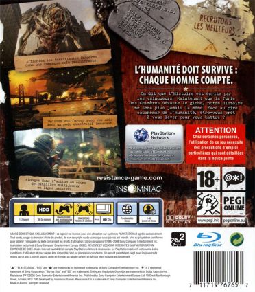 Resistance : Fall of Man sur PS3 est un jeu de tir à la première personne dont l'action se déroule dans un passé alternatif. En 1951, l'Europe n'a pas connu la Seconde Guerre mondiale mais se trouve confrontée à un péril tout aussi grand. Un étrange virus se répand en effet comme une traînée de poudre et transforme les contaminés en monstres répugnants. Le seul espoir de l'humanité repose sur les épaules de Nathan Hale, valeureux soldat de l'armée américaine. Resistance 2, jeu de tir à la première personne sur PS3, reprend là où le premier volet s'était arrêté. Le conflit entre les humains et les Chimères se poursuit et s'étend finalement au territoire américain. Nathan Hale doit livrer un combat désespéré contre ses ennemis, mais aussi contre l'infection qui le ronge depuis le début. Outre sa campagne solo, le jeu propose un mode coopératif capable d'accueillir 8 joueurs en même temps. Et sur internet, c'est à 60 qu'il est possible de combattre.