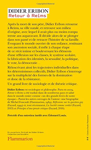 Après la mort de son père, Didier Eribon retourne à Reims, sa ville natale, et retrouve son milieu d'origine, avec lequel il avait plus ou moins rompu trente ans auparavant. Il décide alors de se plonger dans son passé et de retracer l'histoire de sa famille. Évoquant le monde ouvrier de son enfance, restituant son ascension sociale, il mêle à chaque étape de ce récit intime et bouleversant les éléments d'une réflexion sur les classes, le système scolaire, la fabrication des identités, la sexualité, la politique, le vote, la démocratie...Réinscrivant ainsi les trajectoires individuelles dans les déterminismes collectifs, Didier Eribon s'interroge sur la multiplicité des formes de la domination et donc de la résistance.Un grand livre de sociologie et de théorie critique.