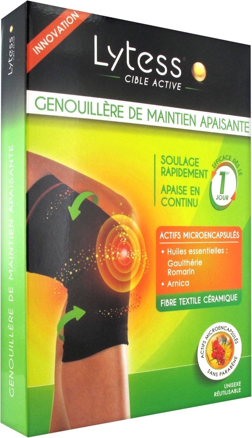 Lytess Cible Active Genouillère de Maintien Apaisante soulage et apaise rapidement et en continu, en diffusant un concentré d'actifs micro-encapsulés à base d'huiles essentielles associé à une fibre céramique. Le textile souple de la genouillère s'adapte parfaitement à la morphologie et apporte confort et liberté de mouvement. Les zones de tricotage renforcées au niveau des articulations soutiennent et maintiennent le genou. La fibre céramique favorise le drainage des tissus et régule la température de la peau. Elle procure une sensation de confort et de bien-être. Les actifs micro-encapsulés apportent plusieurs propriétés : l'huile essentielle de gaulthérie calme, l'huile essentielle de romarin relaxe et décontracte, l'huile essentielle de menthol et arnica apaisent, l'huile d'amande douce protège et hydrate. Lorsque la genouillère est portée, le frottement du tissu sur la peau permet de progressivement libérer les actifs micro-encapsulés. La genouillère est compatible avec une activité sportive et se porte discrètement sous les vêtements.