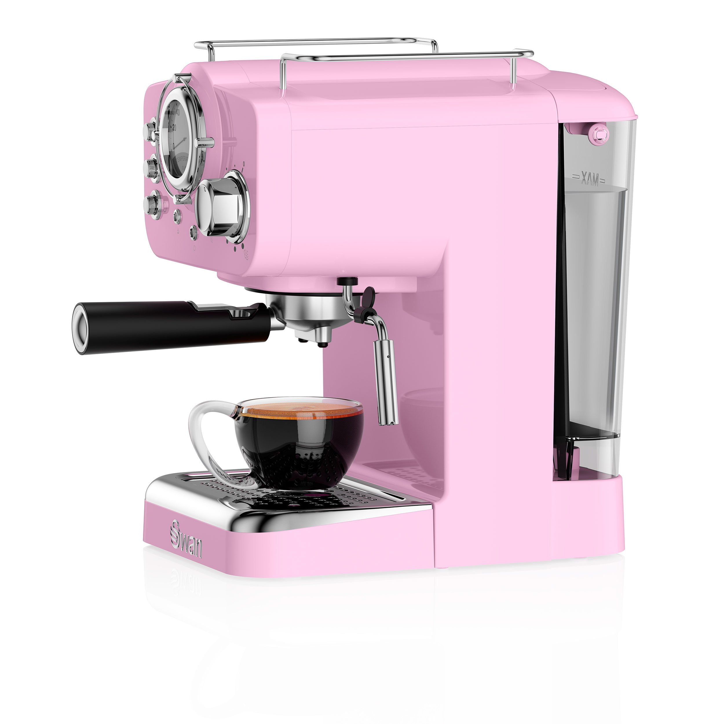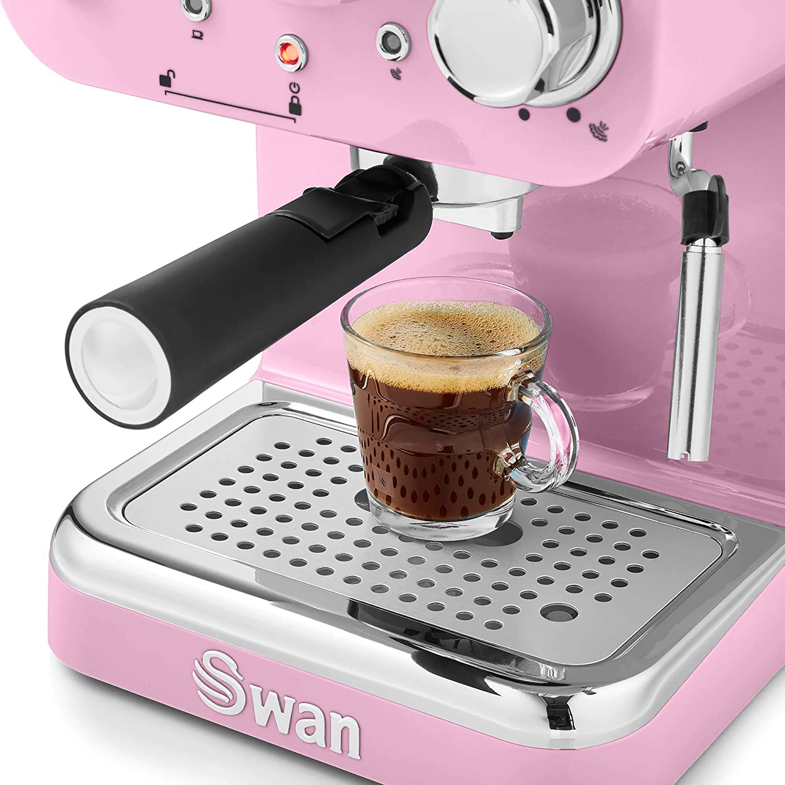 La machine à expresso Swan est équipée d'un mousseur à lait à vapeur qui développe 15 bars de pression pour les meilleurs cappuccinos.