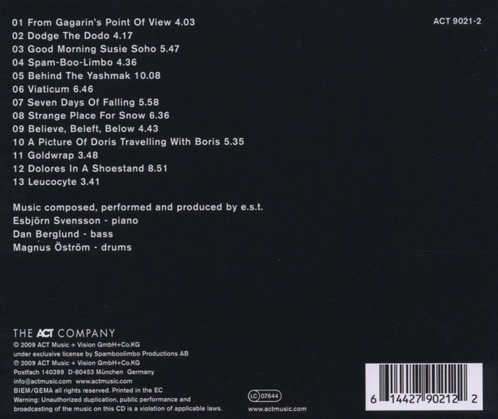 | Liste des pistes | 1.01 . from gagarin's point of view - Esbjorn Svensson Trio1.02 . dogde the dodo - Esbjorn Svensson Trio1.03 . good morning susie soho - Esbjorn Svensson Trio1.04 . spam-boo-limbo - Esbjorn Svensson Trio1.05 . behind the yashmak - Esbjorn Svensson Trio1.06 . viaticum - Esbjorn Svensson Trio1.07 . seven days of falling - Esbjorn Svensson Trio1.08 . strange place for snow - Esbjorn Svensson Trio1.09 . believe,beleft,below - Esbjorn Svensson Trio1.10 . a picture of doris travelling with boris - Esbjorn Svensson Trio1.11 . goldwrap - Esbjorn Svensson Trio1.12 . dolores in a shoestand - Esbjorn Svensson Trio1.13 . leucocyte - Esbjorn Svensson Trio |