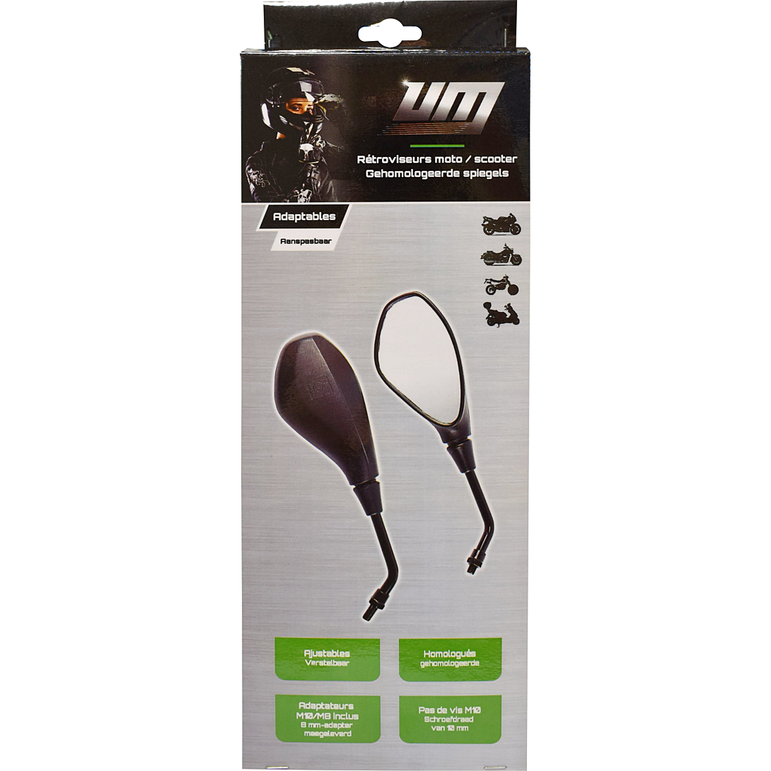 Pas de vis : 10 mm. Adaptateurs 8 mm inclus. Les rétroviseurs UM sont homologués selon le règlement UN-ECE R81 et compatibles avec un grand nombre de véhicules 2 roues grâce à leur pas de vis de 10mm ainsi qu’à leurs adaptateurs pour pas de vis de 8mm.
