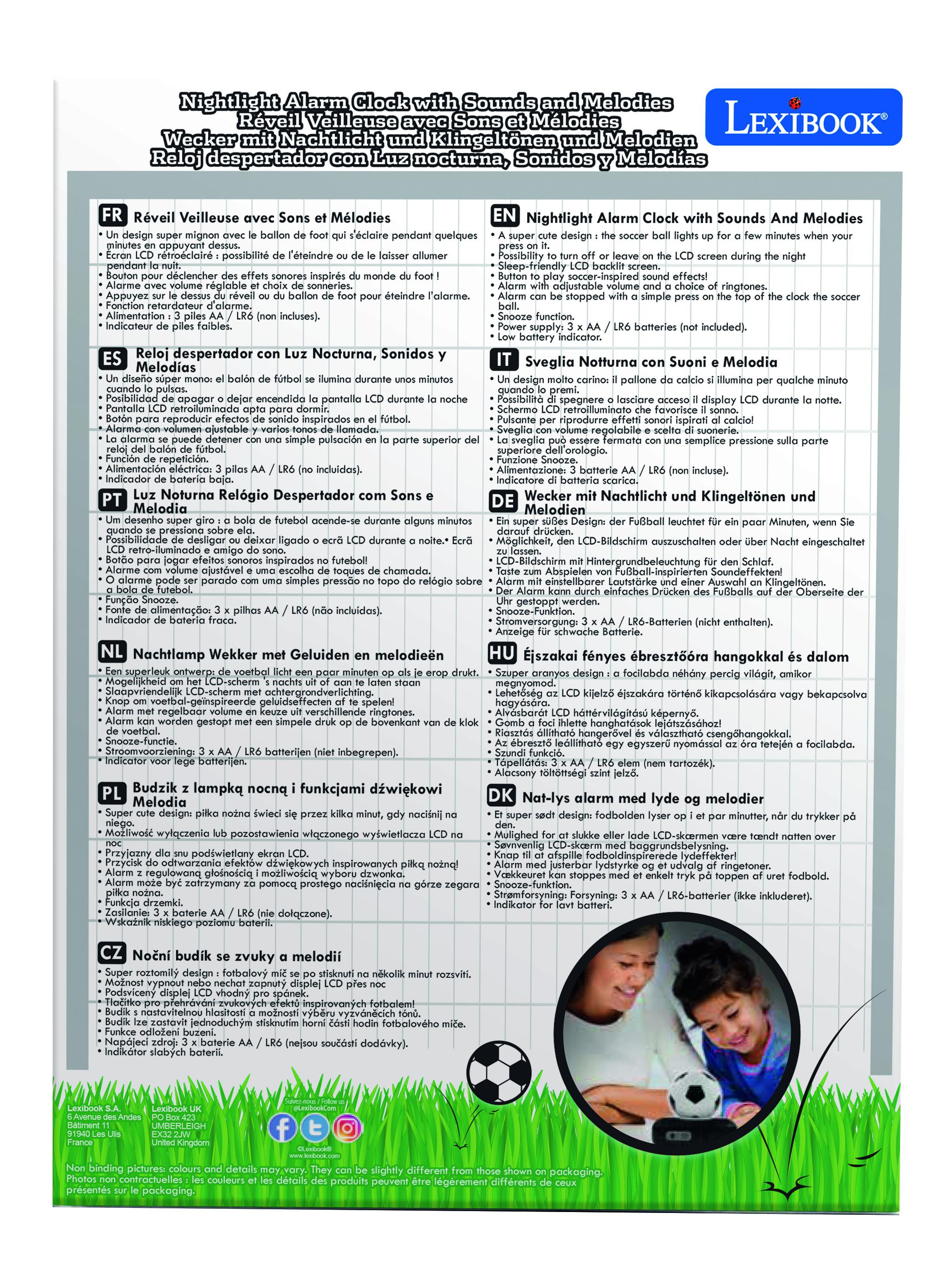 • Un design magnifique avec le ballon de foot qui s'illumine pendant quelques minutes lorsque vous appuyez sur le haut de l'horloge/ballon. • Écran LCD rétroéclairé. • Possibilité d'éteindre complètement l'écran LCD pour profiter d'une nuit sans lumière. • Bouton pour déclencher des effets sonores inspirés du monde du football ! • Alarme avec un choix de sonneries inspirées du monde du foot. • Appuyez sur le haut de l'horloge/du personnage pour arrêter l'alarme ou éclairer l'écran et le ballon. • Fonction Snooze. • Indicateur de pile faible. • Fonctionne avec 3 x LR 6 / AA (non incluses).