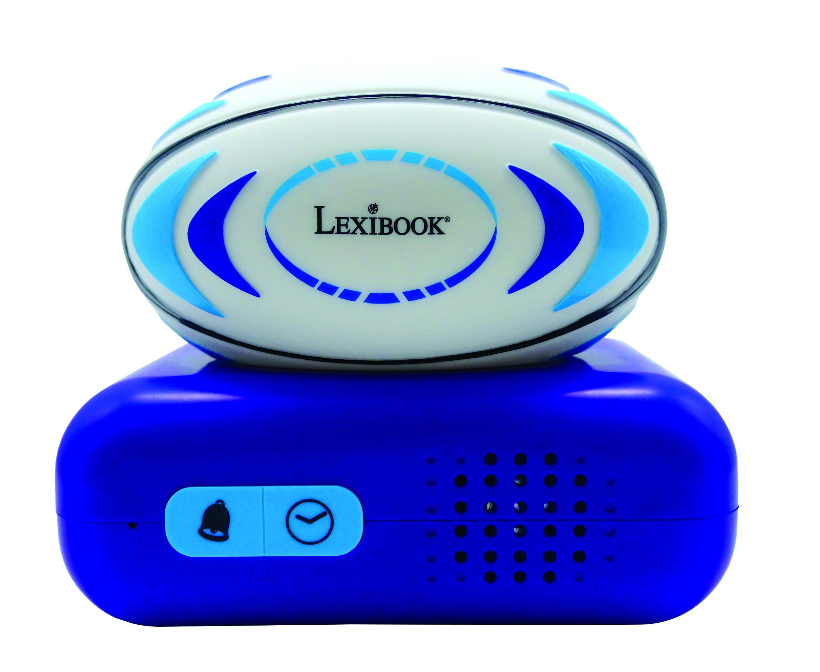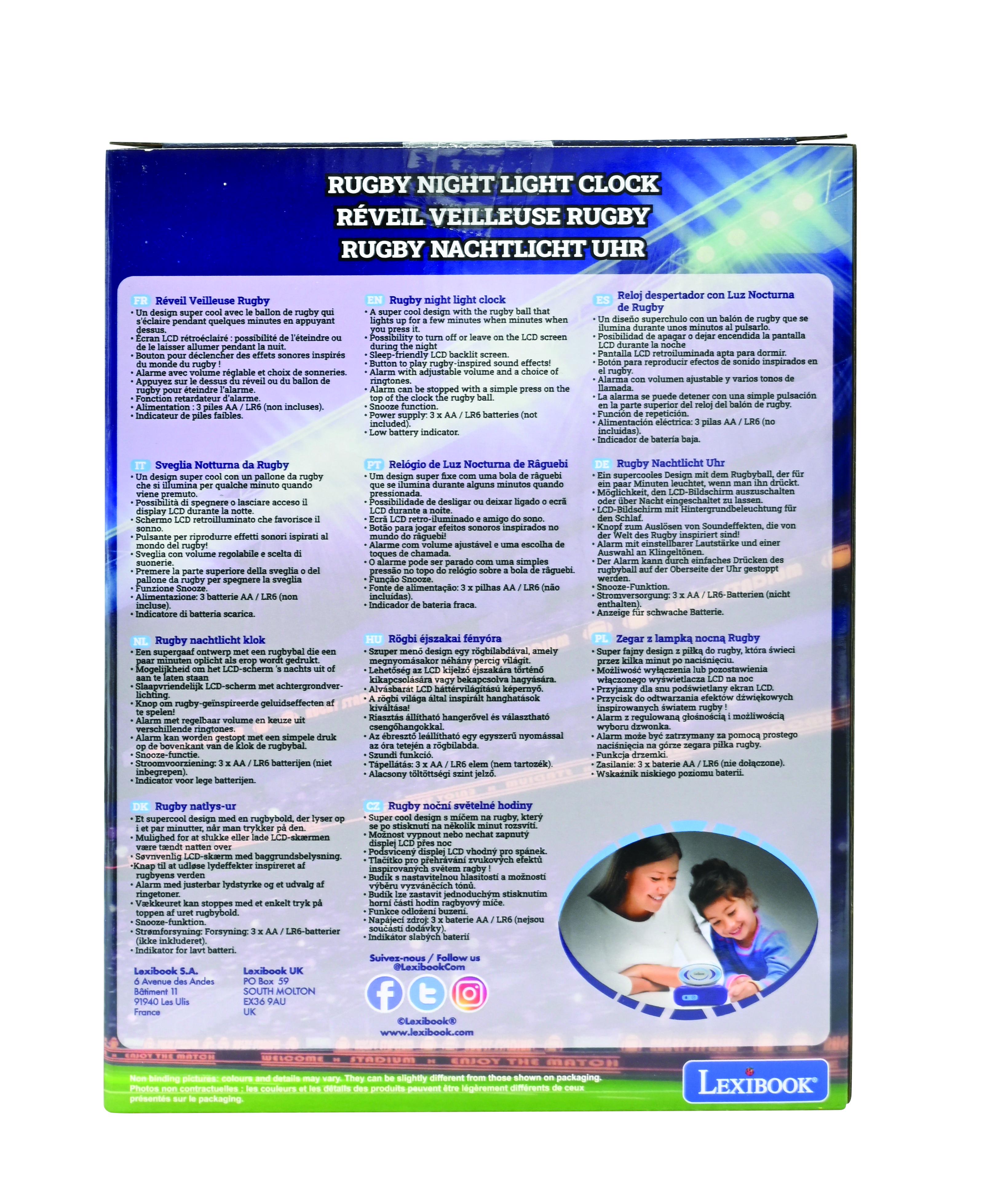 • Un design magnifique avec le ballon de rugby qui s'illumine pendant quelques minutes lorsque vous appuyez sur le haut de l'horloge/personnage. • Écran LCD rétroéclairé. • Possibilité d'éteindre complètement l'écran LCD pour profiter d'une nuit sans lumière. • Bouton pour déclencher des effets sonores inspirés du monde du rugby ! • Alarme avec un choix de sonneries inspirées du monde du rugby. • Appuyez sur le haut de l'horloge/du personnage pour arrêter l'alarme ou éclairer l'écran et le personnage. • Fonction Snooze. • Indicateur de pile faible. • Fonctionne avec 3 x LR 6 / AA (non incluses).