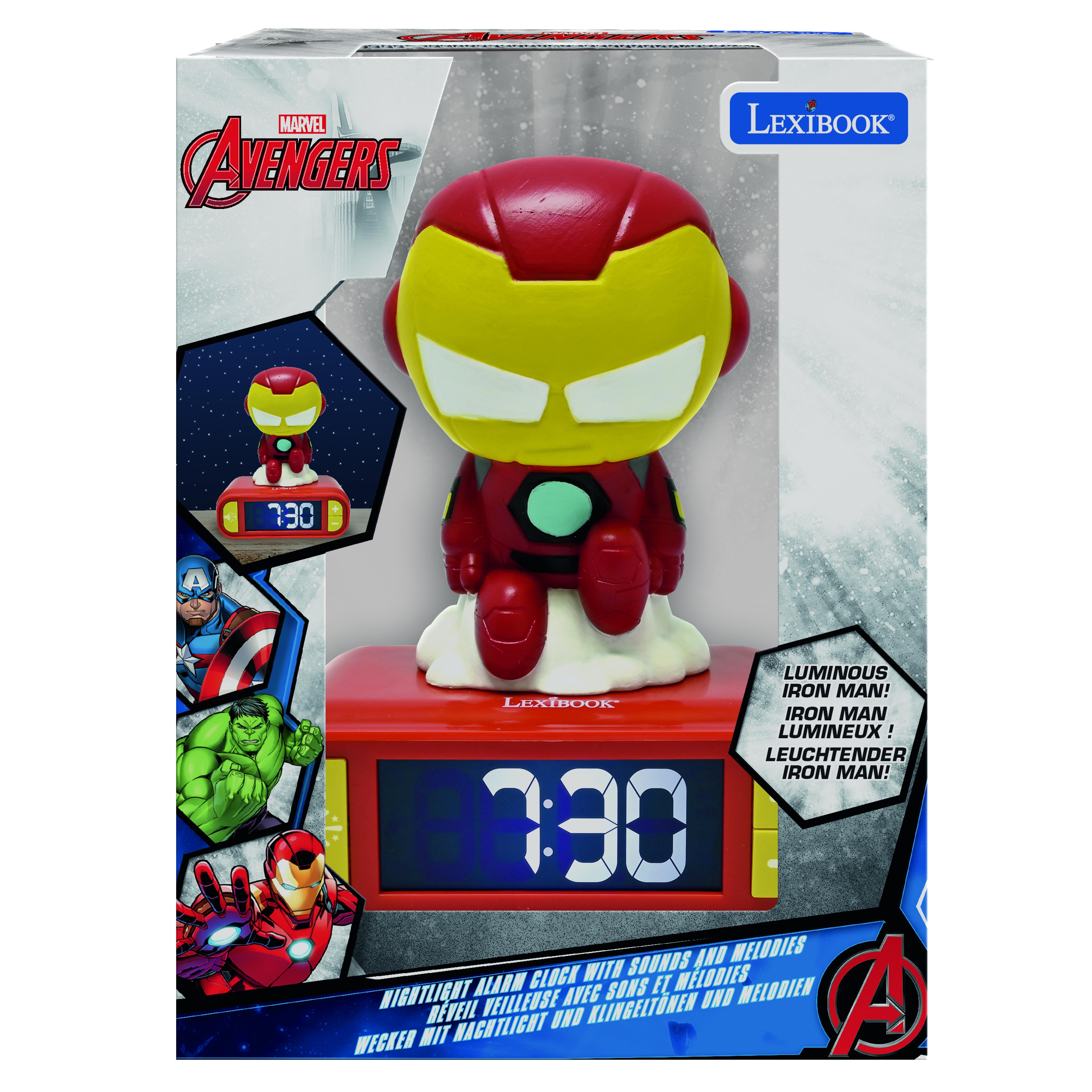 | Plus produit | Réveil-veilleuse Iron Man 3D avec 6 sonneries Avengers, écran LCD rétroéclairé, veilleuse activable en appuyant sur le sommet, fonction snooze, alimentation secteur et 3 piles LR6/AA, indicateur de piles faibles. |