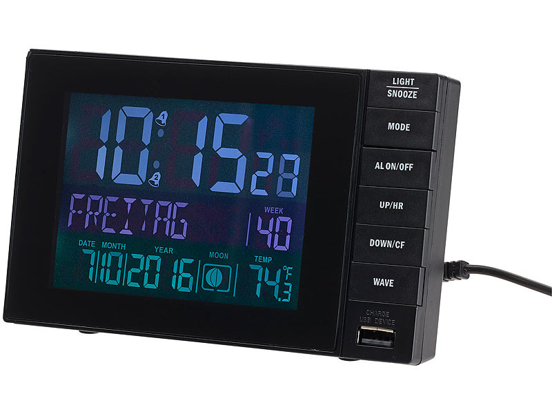 Grâce à la réception du signal radio de l'horloge atomique, ce réveil Infactory est toujours à l'heure et effectue lui-même le changement d'heure. En plus de l'heure, l'écran LED indique également la date, le jour de la semaine et la température ambiante. Vous trouverez même un port de chargement pour appareils mobiles : le port USB intégré vous permet de recharger un smartphone, une liseuse, etc, directement sur votre table de nuit. Inutile de partir à la recherche d'un chargeur et d'une prise de courant disponible ! Réveil digital radio-piloté avec port USB par Infactory Affichage de l'heure exacte grâce à la réception du signal de l'horloge atomique Passage automatique heure d'été / heure d'hiver Affichage de la date, du jour de la semaine, de la phase de la lune et de la température ambiante Port de chargement USB pour smartphone, tablette, liseuse etc. Écran LED : diagonale 11,2 cm (4,41") Affichage au format 12 ou 24 heures Port de chargement USB : 5 V, 2 A (seulement avec adaptateur secteur) Alimentation : Micro-USB (adaptateur secteur fourni, longueur du câble : 180 cm) ou 2 piles AAA Micro (non fournies) Dimensions : 151 x 89 x 50 mm, poids : 172 g