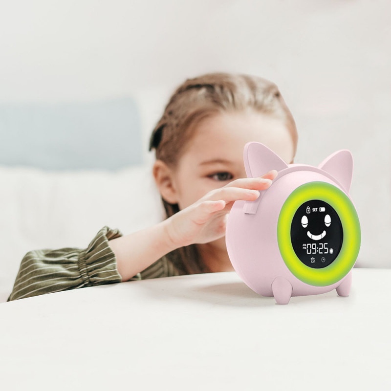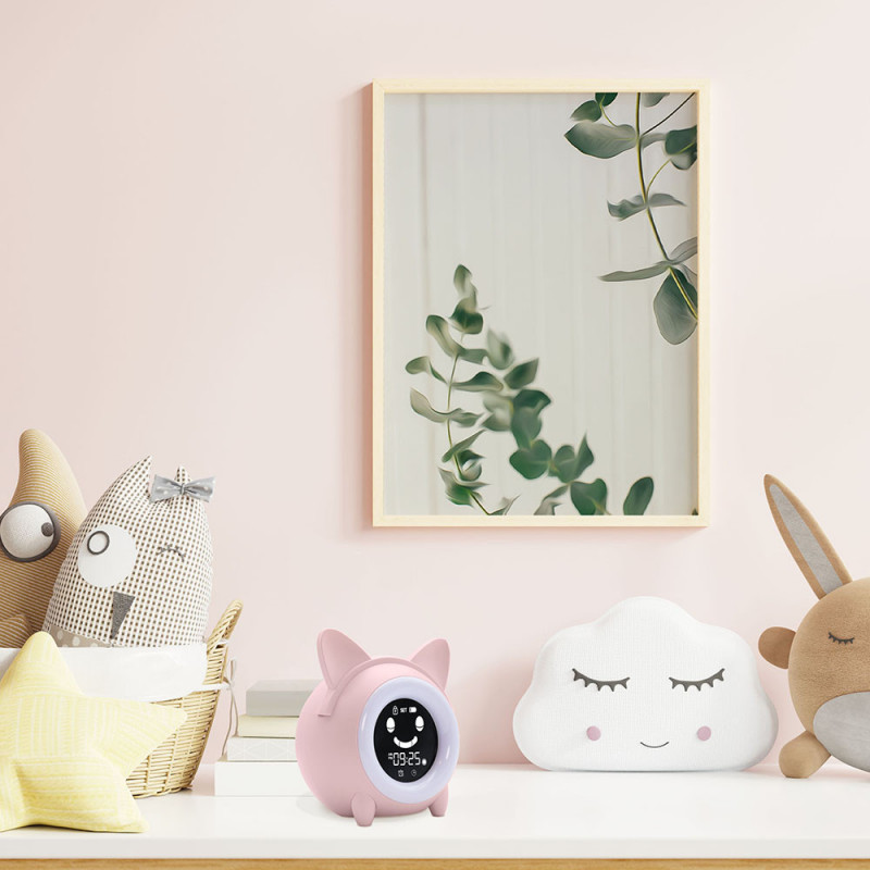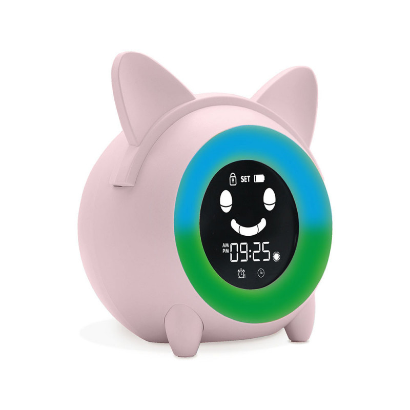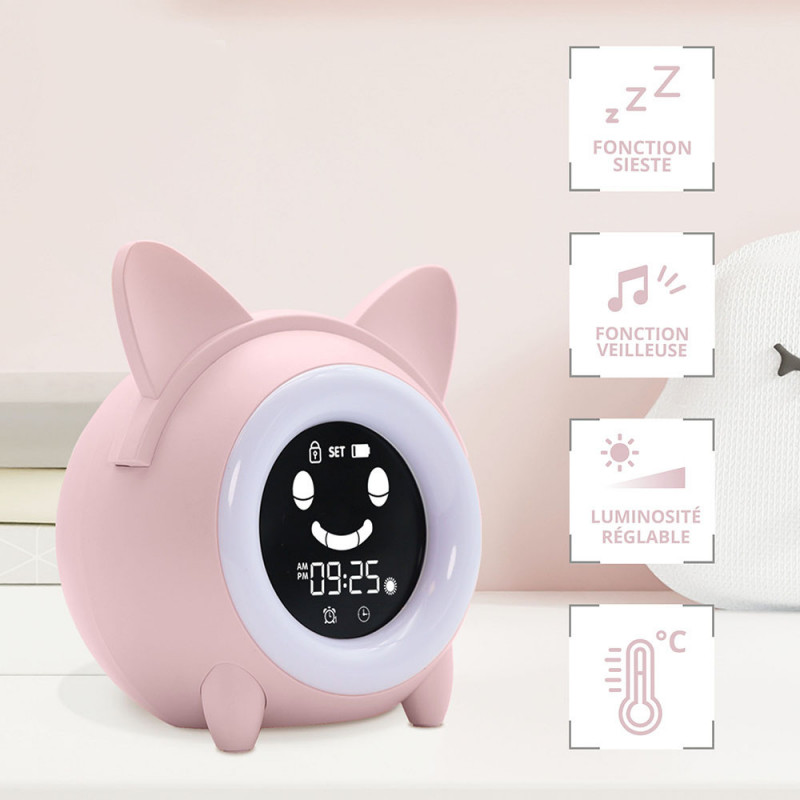 Le réveil EDEN est le compagnon idéal pour apprendre à votre enfant à faire ses nuits en toute autonomie. De façon ludique, le réveil EDEN communique avec votre enfant grâce aux jeux de lumières, aux expressions faciales et aux icônes intégrés pour l'aider à trouver son rythme de sommeil. 30 minutes avant l'heure du coucher, une lumière bleue apparaît pour signifier à votre enfant qu'il est bientôt l'heure d'aller se coucher. Après 30 minutes, les yeux du réveil EDEN se ferment, la luminosité de l'écran devient faible : il est l'heure de dormir et l'icône de la lune apparaît sur l'écran. 30 minutes avant l'heure du réveil, une lumière jaune apparaît, les yeux du réveil EDEN s'ouvrent et l'icône du soleil apparaît sur l'écran. Quand la lumière passe au vert, il est l'heure de se lever et de débuter une nouvelle journée. Le réveil EDEN est multifonctions : veilleuse avec 5 couleurs disponibles et 3 mélodies au choix pour favoriser l'endormissement de votre enfant. Les niveaux du volume et de l'intensité de l'écran sont réglables. - Multifonctions Réveil, alarme, veilleuse, fonction sieste, musique. - Affichage LCD avec luminosité réglable. - Alimentation Câble USB et adaptateur secteur fournis - Pile de sauvegarde de l'heure CR2032