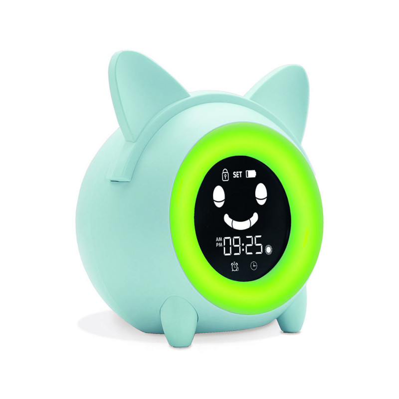 Le réveil CELESTE est le compagnon idéal pour apprendre à votre enfant à faire ses nuits en toute autonomie. De façon ludique, le réveil CELESTE communique avec votre enfant grâce aux jeux de lumières, aux expressions faciales et aux icônes intégrés pour l'aider à trouver son rythme de sommeil. 30 minutes avant l'heure du coucher, une lumière bleue apparaît pour signifier à votre enfant qu'il est bientôt l'heure d'aller se coucher. Après 30 minutes, les yeux du réveil CELESTE se ferment, la luminosité de l'écran devient faible : il est l'heure de dormir et l'icône de la lune apparaît sur l'écran. 30 minutes avant l'heure du réveil, une lumière jaune apparaît, les yeux du réveil CELESTE s'ouvrent et l'icône du soleil apparaît sur l'écran. Quand la lumière passe au vert, il est l'heure de se lever et de débuter une nouvelle journée. Le réveil CELESTE est multifonctions : veilleuse avec 5 couleurs disponibles et 3 mélodies au choix pour favoriser l'endormissement de votre enfant. Les niveaux du volume et de l'intensité de l'écran sont réglables. - Multifonctions Réveil, alarme, veilleuse, fonction sieste, musique. - Affichage LCD avec luminosité réglable. - Alimentation Câble USB et adaptateur secteur fournis - Pile de sauvegarde de l'heure CR2032