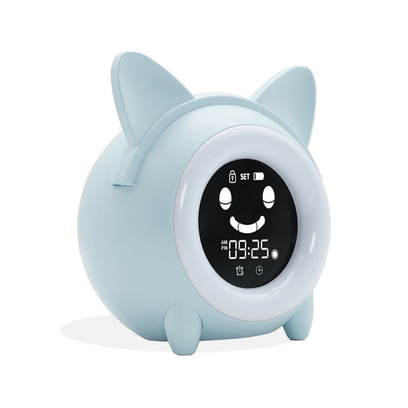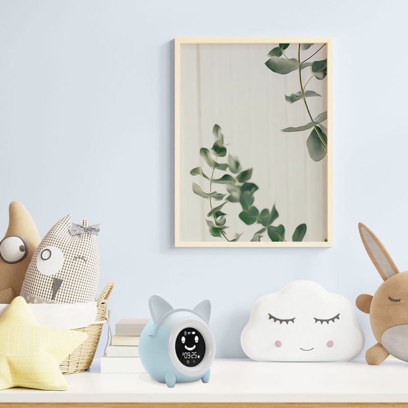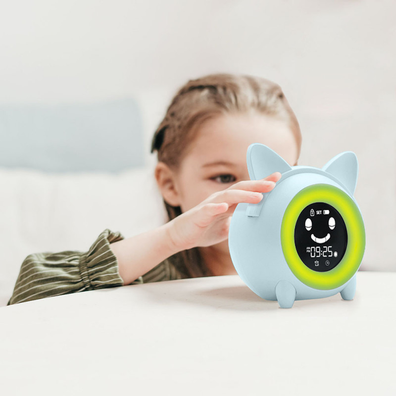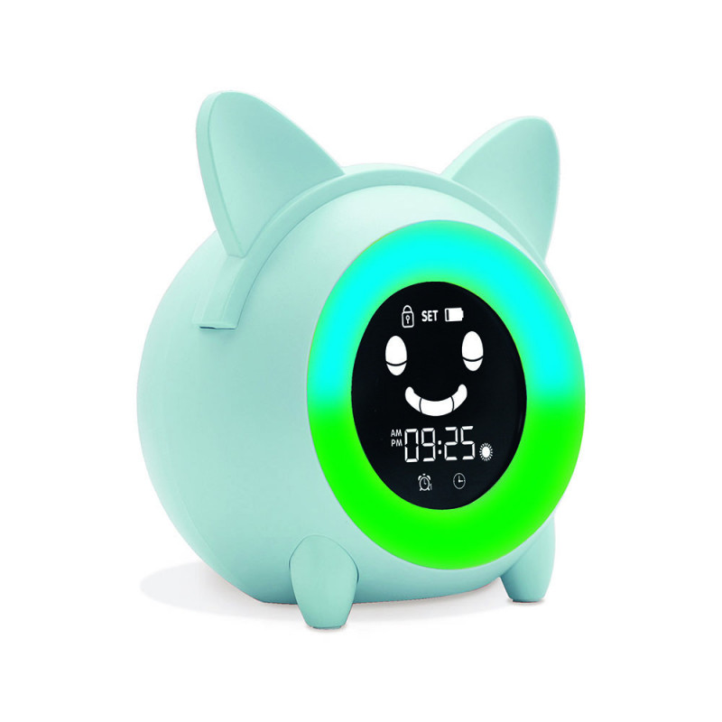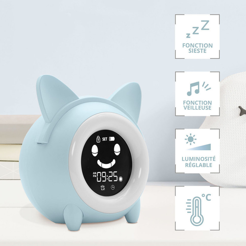 Le réveil CELESTE est le compagnon idéal pour apprendre à votre enfant à faire ses nuits en toute autonomie. De façon ludique, le réveil CELESTE communique avec votre enfant grâce aux jeux de lumières, aux expressions faciales et aux icônes intégrés pour l'aider à trouver son rythme de sommeil. 30 minutes avant l'heure du coucher, une lumière bleue apparaît pour signifier à votre enfant qu'il est bientôt l'heure d'aller se coucher. Après 30 minutes, les yeux du réveil CELESTE se ferment, la luminosité de l'écran devient faible : il est l'heure de dormir et l'icône de la lune apparaît sur l'écran. 30 minutes avant l'heure du réveil, une lumière jaune apparaît, les yeux du réveil CELESTE s'ouvrent et l'icône du soleil apparaît sur l'écran. Quand la lumière passe au vert, il est l'heure de se lever et de débuter une nouvelle journée. Le réveil CELESTE est multifonctions : veilleuse avec 5 couleurs disponibles et 3 mélodies au choix pour favoriser l'endormissement de votre enfant. Les niveaux du volume et de l'intensité de l'écran sont réglables. - Multifonctions Réveil, alarme, veilleuse, fonction sieste, musique. - Affichage LCD avec luminosité réglable. - Alimentation Câble USB et adaptateur secteur fournis - Pile de sauvegarde de l'heure CR2032
