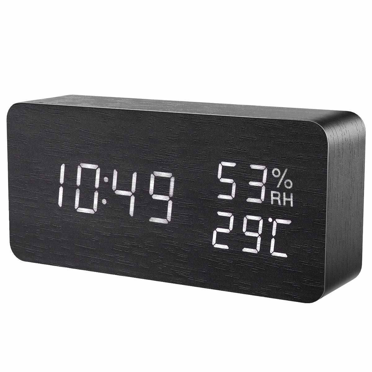 Réveil numérique LED élégant avec heure, température et date : Le réveil moderne et élégant présente une finition en bois noir sans boutons ni détails inutiles visibles de face. Il affiche l'heure, la température et la date. Vous pouvez configurer jusqu'à 3 alarmes pour qu'elle vous réveille le matin et vous rappelle ensuite les dates ou réunions importantes de la journée.