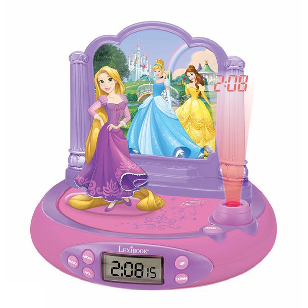 Un radio réveil avec projection de l'heure pour les fans de Disney Princesses. 4 superbes effets sonores Disney Princesses se déclenchent en appuyant sur Raiponce. Radio FM. Affichage numérique de l'heure sur écran LCD. Fonction snooze (répétition de l'alarme). Une simple pression sur la base permet d'enclencher la veilleuse pour une durée maximum de 15 minutes.
