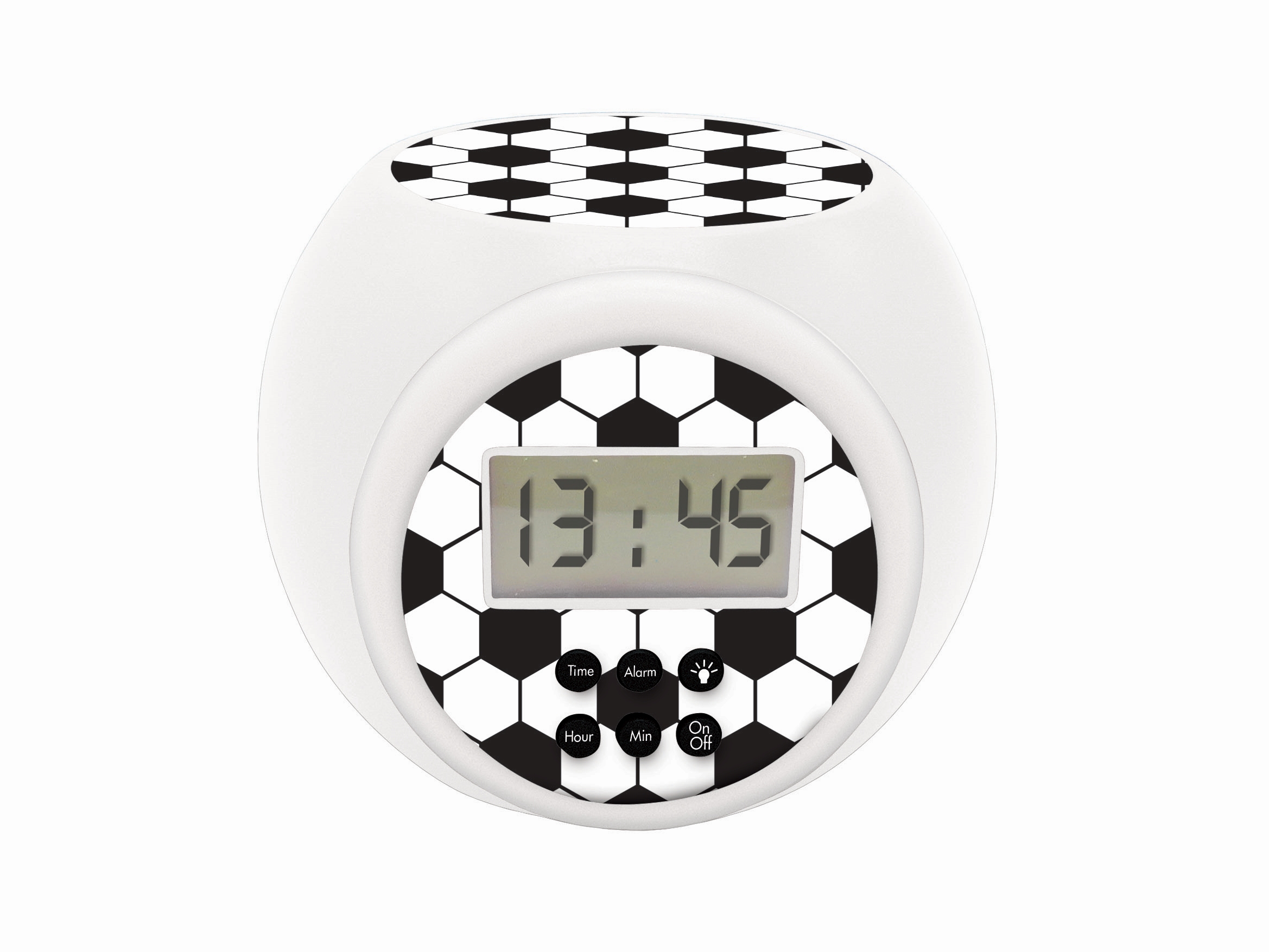 * Réveil projecteur pour enfant Football avec écran LCD avec rétro éclairage bleu. * Veilleuse avec projection d'un ballon de football au plafond en 3 couleurs pour créer une atmosphère incroyable la nuit ! Avec auto-extinction (5/10/15 min). * Alarme avec fonction retardateur (snooze), pour se réveiller du bon pied. * Très intuitif avec des réglages faciles, des boutons larges et sûr pour les enfants à utiliser à tout moment * Alimentation : 3 piles AAA / LR03 (non incluses).
