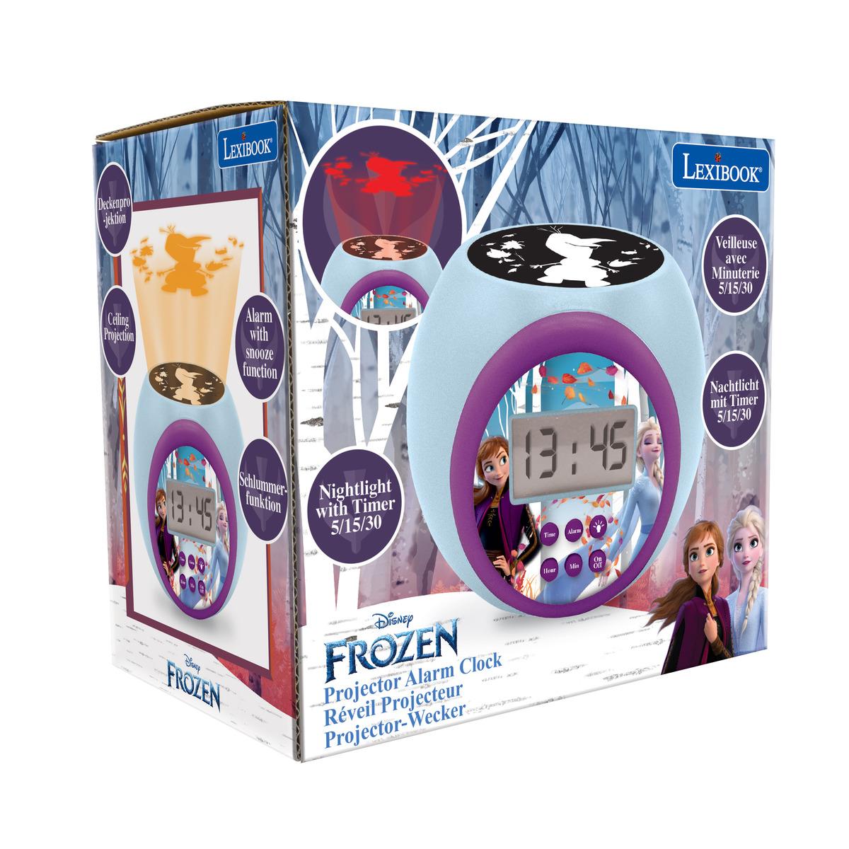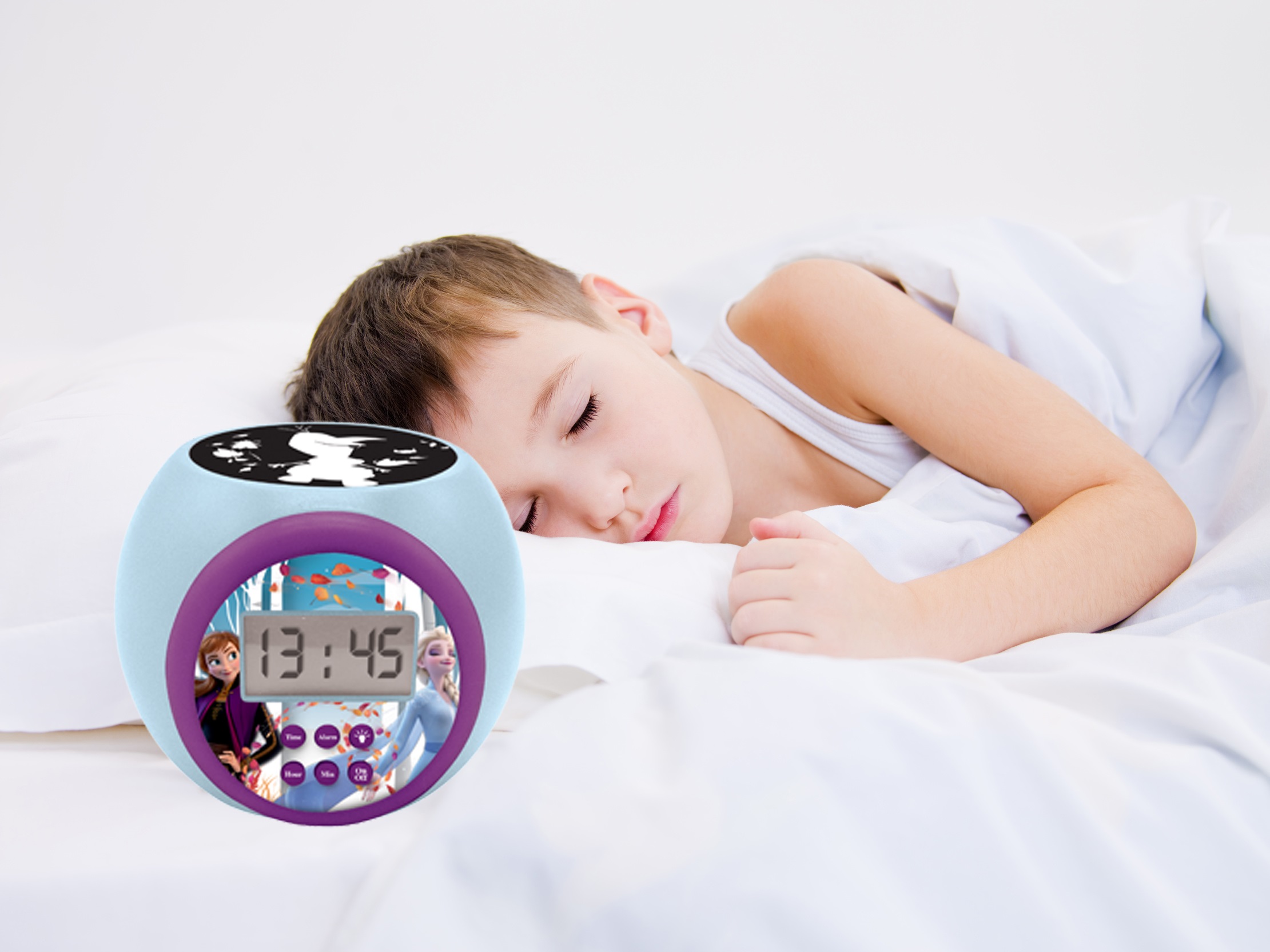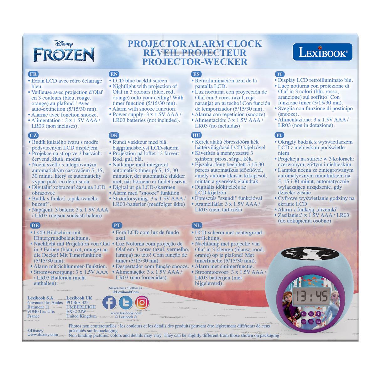 • Design arrondi avec écran LCD rétroéclairé en bleu • Affichage numérique de l'heure sur l'écran LCD (formats 12/24H) • Une projection Olaf au plafond en 3 couleurs (bleu, rouge, orange). • Veilleuse avec minuterie automatique intégrée de 5,15 ou 30 minutes qui s’éteint automatiquement après l'endormissement des enfants. • Alarme avec fonction "snooze" (répétition) • Alimentation : 3 LR03/AAA (non fournies) • Dimensions produit : 11,8 x 11 x 9,1 cm.