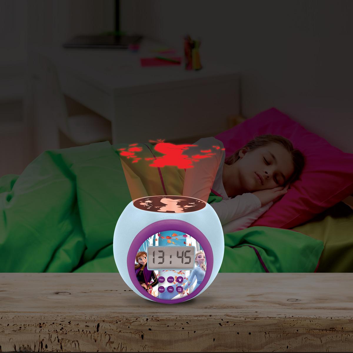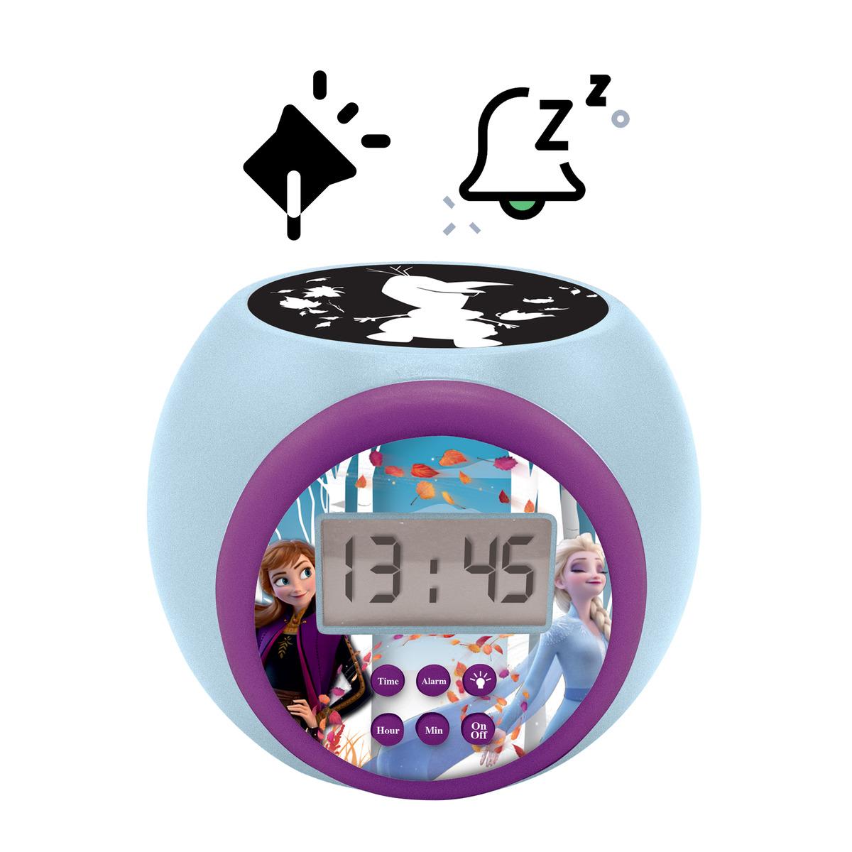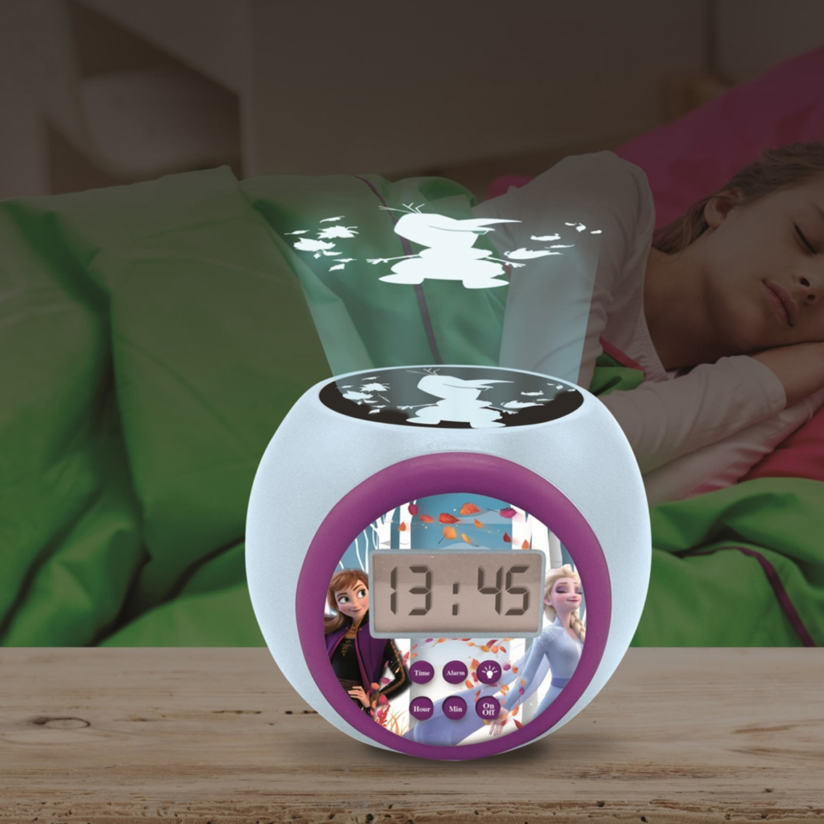 • Design arrondi avec écran LCD rétroéclairé en bleu • Affichage numérique de l'heure sur l'écran LCD (formats 12/24H) • Une projection Olaf au plafond en 3 couleurs (bleu, rouge, orange). • Veilleuse avec minuterie automatique intégrée de 5,15 ou 30 minutes qui s’éteint automatiquement après l'endormissement des enfants. • Alarme avec fonction "snooze" (répétition) • Alimentation : 3 LR03/AAA (non fournies) • Dimensions produit : 11,8 x 11 x 9,1 cm.