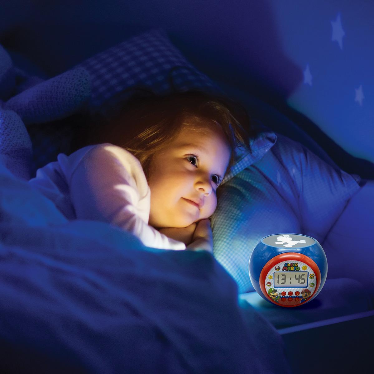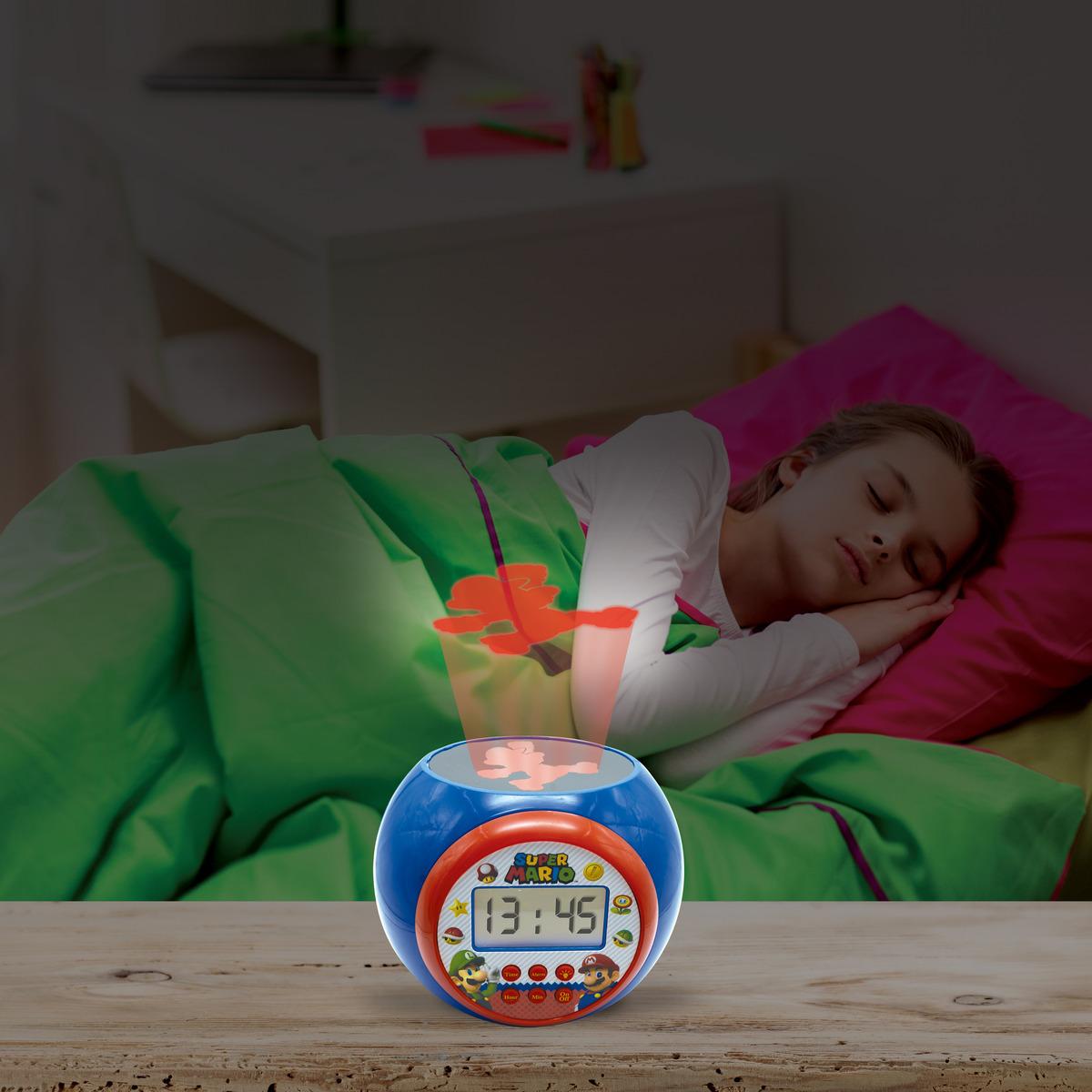 * Réveil projecteur pour enfant Super Mario avec écran LCD et son rétro éclairage bleu. * Veilleuse avec projection de Mario au plafond en 3 couleurs pour créer une atmosphère incroyable la nuit ! Avec auto-extinction (5/10/15 mn). * Alarme avec fonction retardateur (snooze), pour se réveiller en douceur avec les héros Nintendo : Mario et Luigi. * Très intuitif avec des réglages faciles, des boutons larges et sûr pour les enfants à utiliser à tout moment. * Alimentation : 3 piles AAA / LR03 (non incluses).