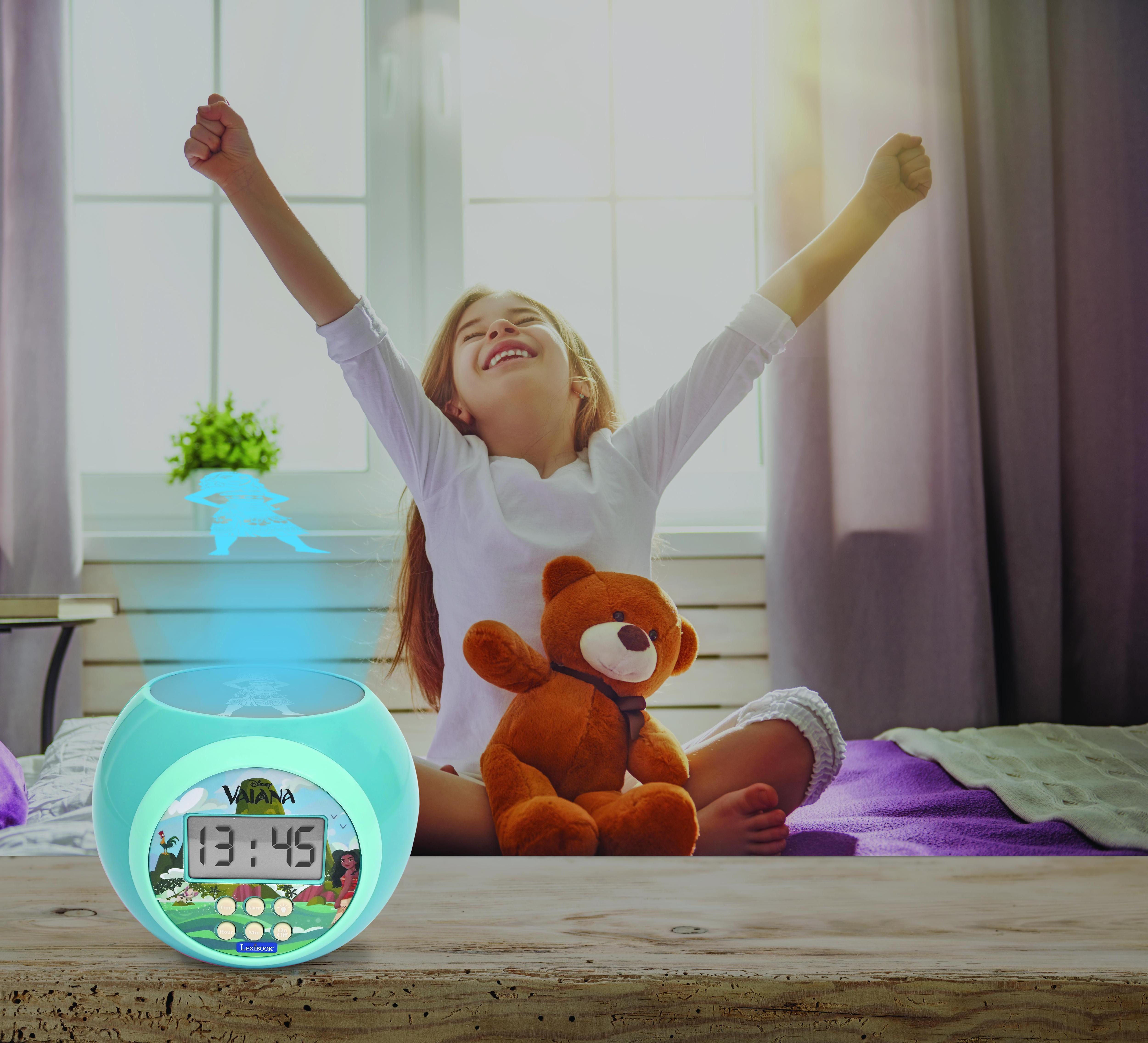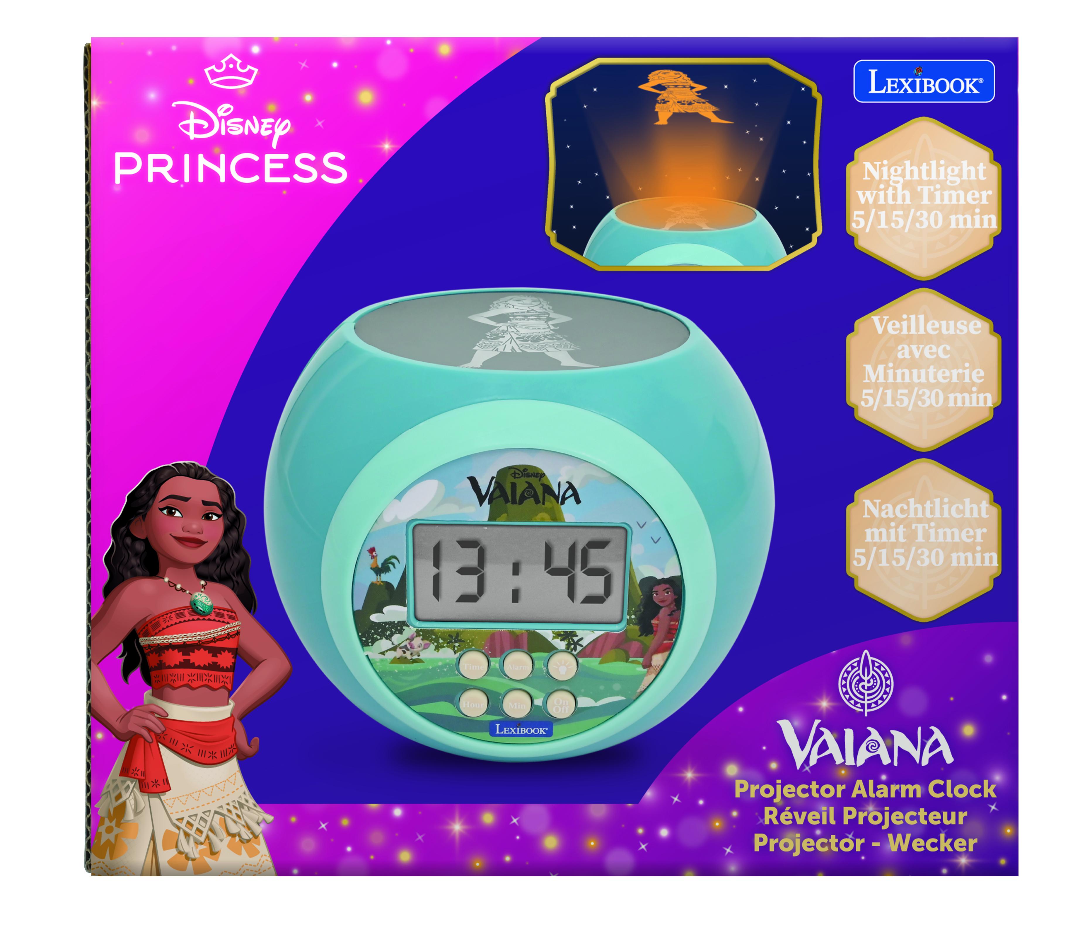 Magnifique Réveil Projecteur Vaiana • Design arrondi avec écran LCD rétroéclairé en bleu • Affichage numérique de l'heure sur l'écran LCD (formats 12/24H) • Une projection Vaiana au plafond en 3 couleurs (bleu, rouge, orange). • Veilleuse avec minuterie automatique intégrée de 5,15,30 minutes pour s'éteindre automatiquement après l'endormissement des enfants. • Alarme avec fonction "snooze" (répétition) • Alimentation : 3 LR03/AAA (non fournies) • Dimensions produit : 11,8 x 11 x 9,1 cm.