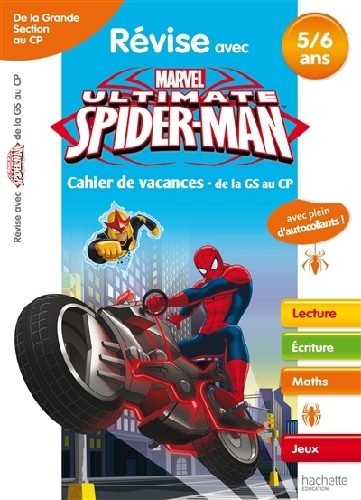 Le cahier de vacances idéal pour revoir l'essentiel du programme de la Grande Section en suivant les aventures de Spider-Man ! . Des exercices simples et variés, des thèmes proches des petits, des jeux et de nombreux autocollants font de l'utilisation de ce cahier un moment de plaisir et d'éveil pour votre enfant. . Plongé dans le monde des super-héros, avec Spider-Man, votre enfant reverra les apprentissages essentiels de son année de maternelle. Connaître les lettres . Reconnaître les lettres minuscules et majuscules. . Former des lettres minuscules. . Localiser un son dans un mot. . Retrouver un mot dans une phrase. Connaître les chiffres et les formes . Compter jusqu'à 20. . Tracer et reconnaître les chiffres. . Ordonner des objets. . Comparer des quantités. Se situer dans le temps et l'espace . Reconnaître des positions relatives : devant, entre... . Représenter un parcours. . Reproduire une frise, un quadrillage.