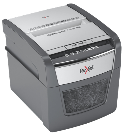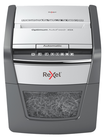 Rexel AutoFeed 45X. Type de déchiquetage: Destruction croisée, Taille de déchiquetage: 4x28 mm, Volume du panier: 20 L. Largeur: 363 mm, Profondeur: 430 mm, Hauteur: 345 mm