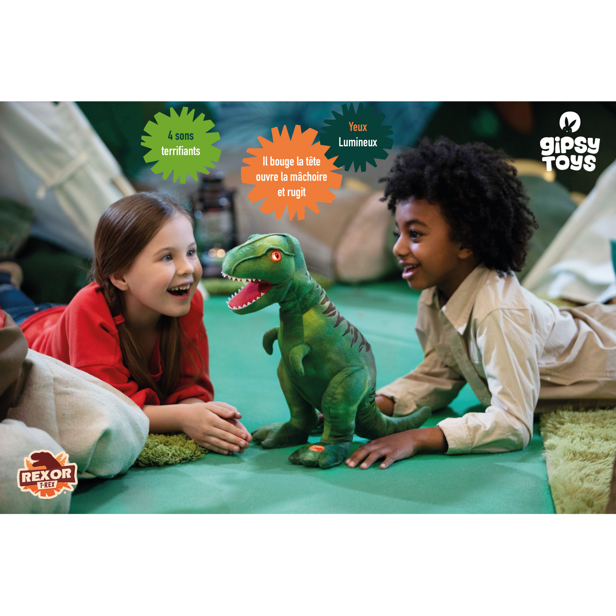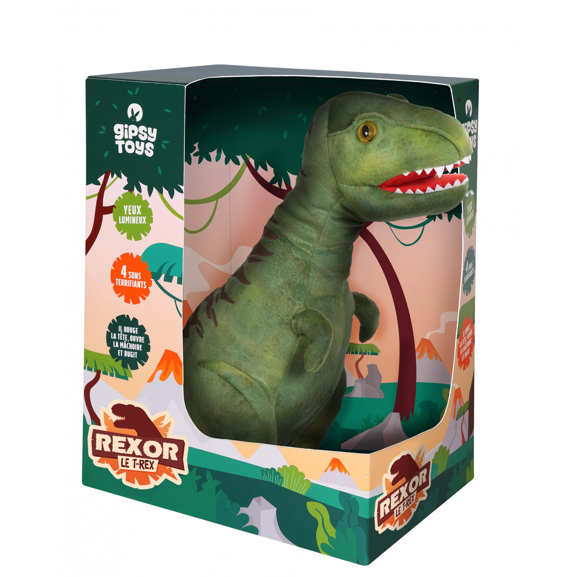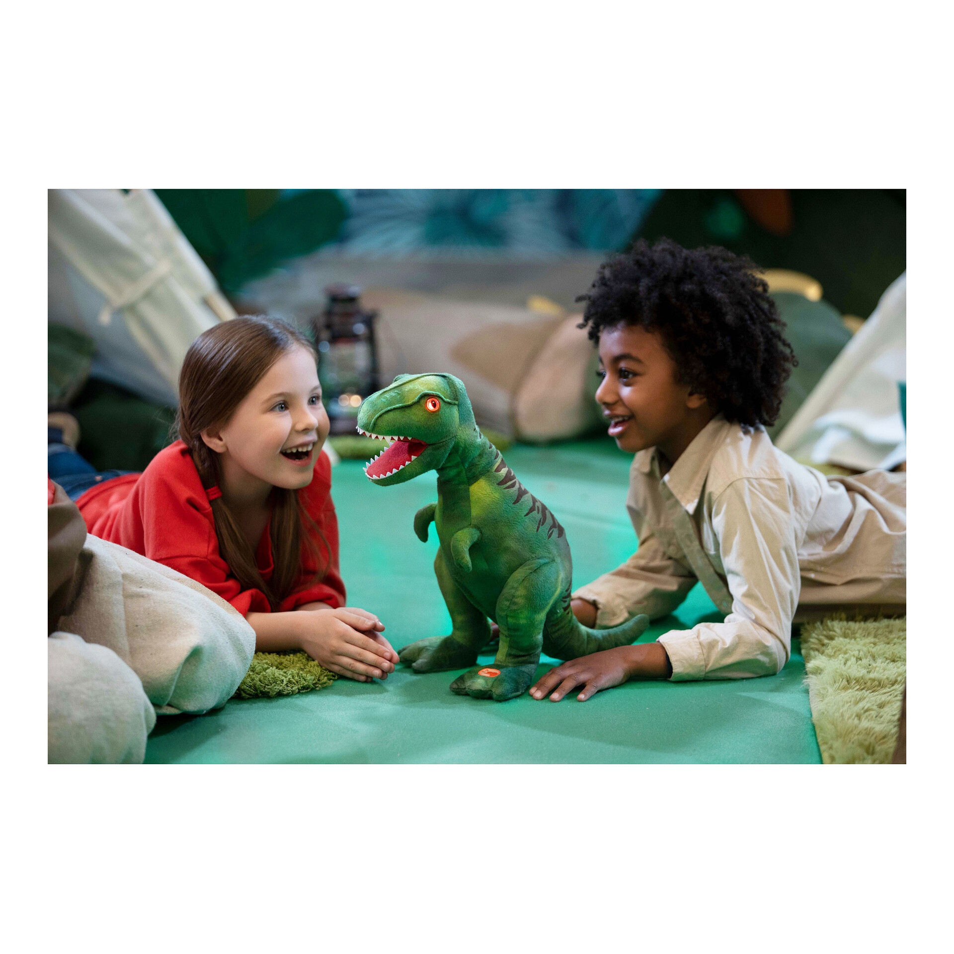 Plongez dans le monde fascinant des dinosaures avec ce magnifique T-rex en peluche à fonctions : 4 sons terrifiants, bouge la tête, ouvre la mâchoire, yeux lumineux