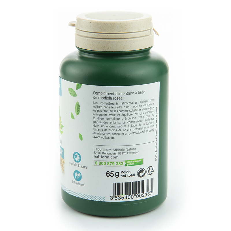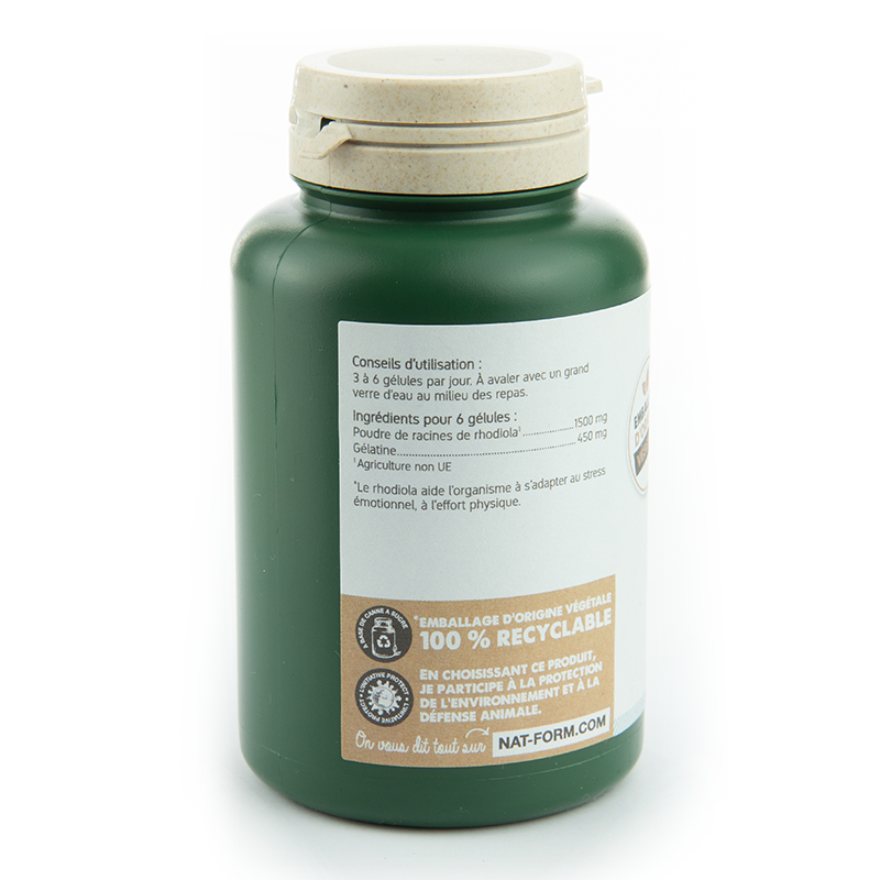 Ingrédients pour 6 gélules : Poudre de racines de rhodiola 1500 mg Gélatine 450 mg
