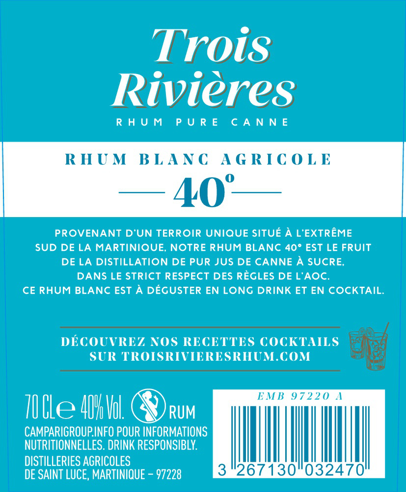 Libellé Rhum agricole Trois Rivières - France, 40 % vol. - 70 cl