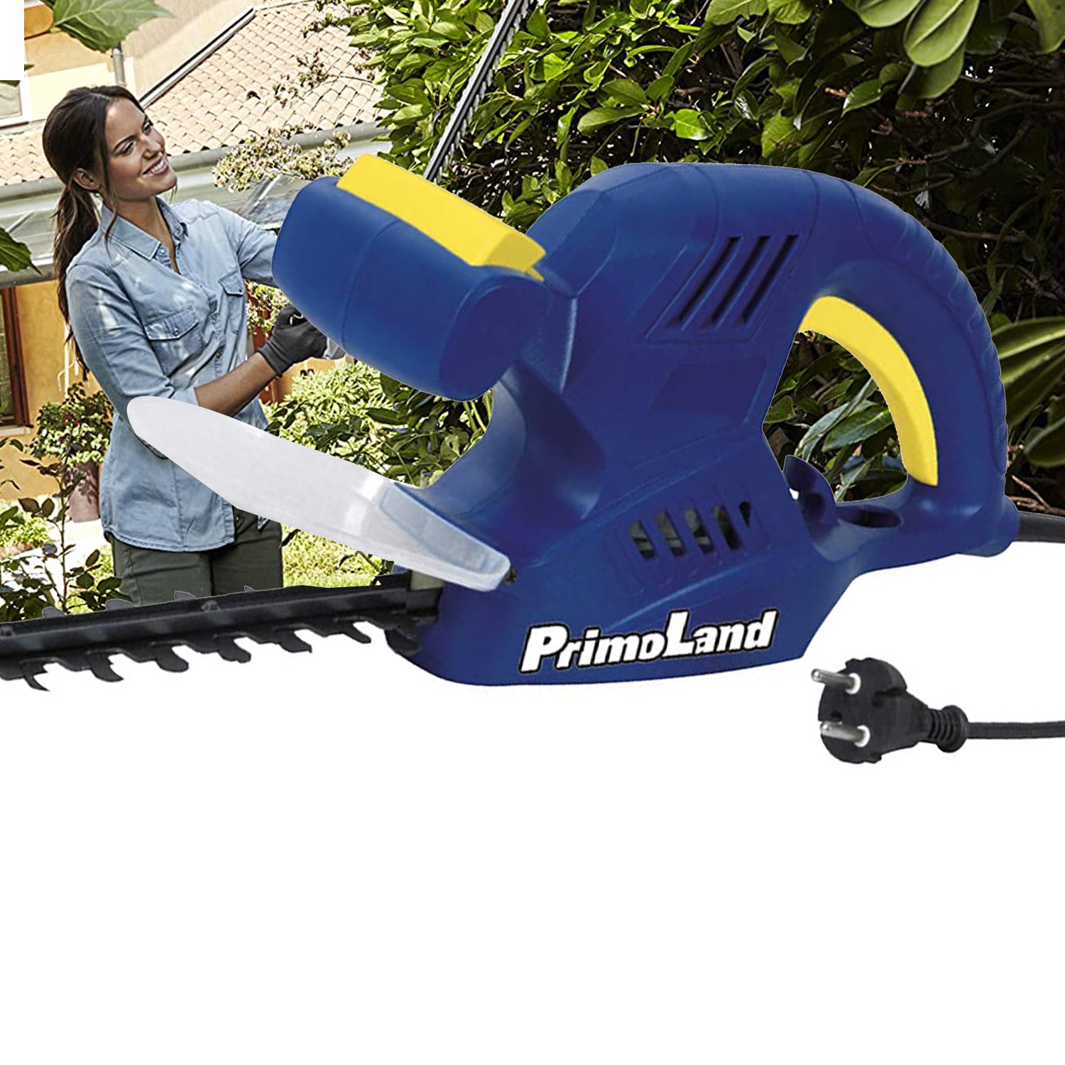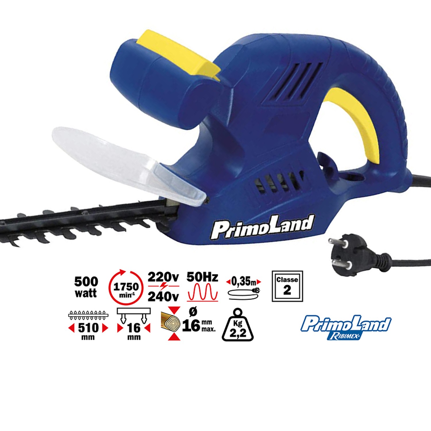 Taille-haies électrique avec lame 510 mm. Moteur 230 V ~ 50 Hz. Puissance 500 W. 1 750 tr/mn. Protection Classe II. Coupe de branches Ø maxi 16 mm. Carter de protection. Mise en marche sécurisée par double commande.