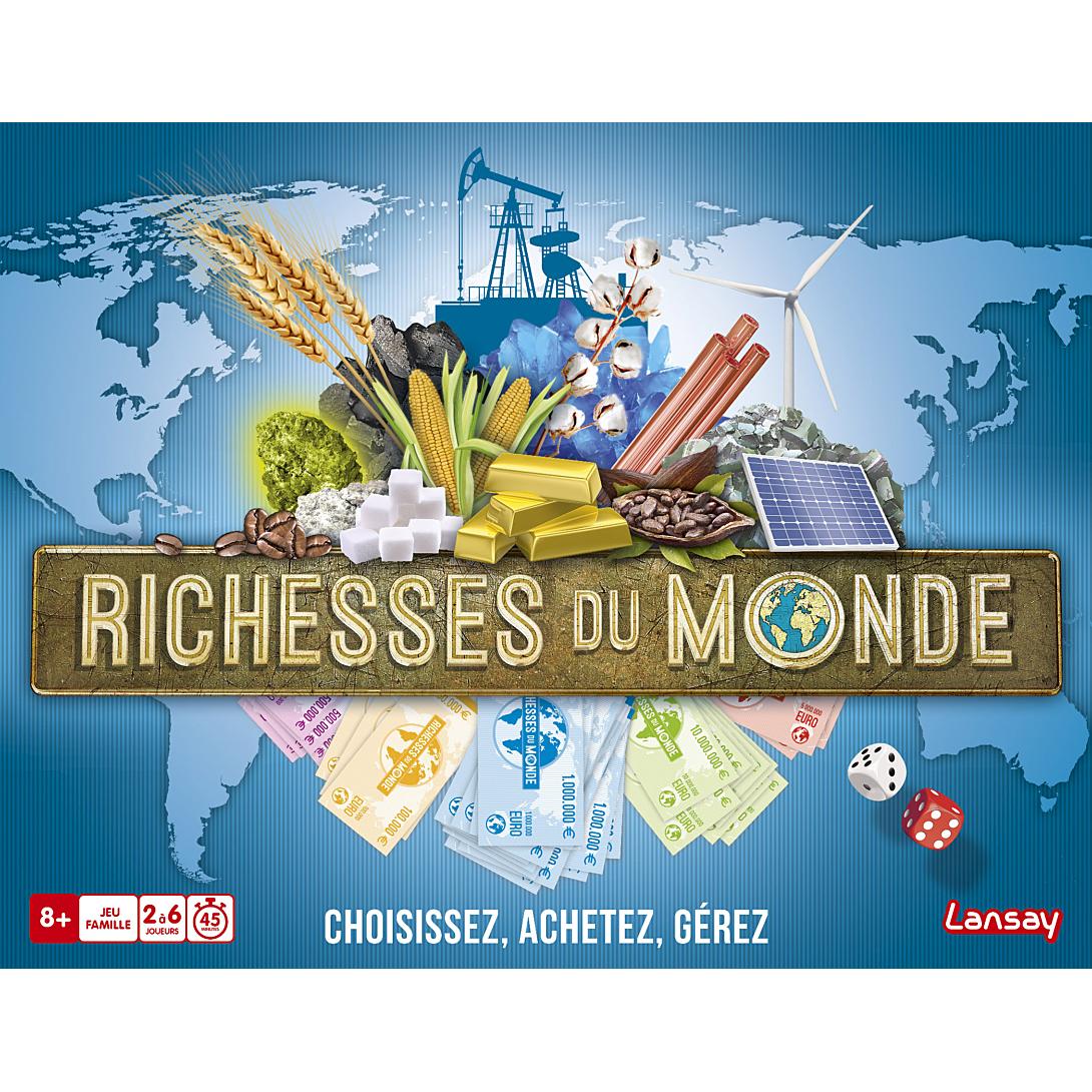 | Plus produit | - Acquiers le plus vite possible les productions de blé, aluminium, coton, café, cuivre etc. dans tous les pays du monde pour gagner ! Tactique, réflexion, audace sont de rigueur pour gagner la partie ! Choisis, achète et gère tes productions dans le monde et fais payer les autres joueurs lorsquils tombent sur tes richesses. \n- Toutes les richesses mondiales et les pays sont mis à jour en fonction des répartitions économiques réelles ! Savez-vous quel pays est le premier producteur mondial de café, dénergie solaire, hydraulique ou encore dénergie éolienne ?\n- Une fois la partie terminée, le jeu se range dans la boite prêt pour une prochaine partie ! \n- Ce jeu privilégie les matériaux naturels : deux dés en bois, sabots des cartes en carton..., et est produit en Europe afin de réduire son empreinte écologique |